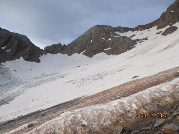 Eigentlich wollten wir bereits am Vortag den Gipfel besteigen, doch eine sehr labile und unberechenbare Wettersituation hielt uns davon ab. Um dennoch die Zeitplanung für unsere Tourenwoche zu halten, stiegen wir nach der Rückkehr vom Gipfel bis zum Parkplatz ab. So kam ein strammer Tourentag zusammen mit 1600 Aufstiegs- und 3100 m Abstiegsmetern. Start vom Cortibiwak um 5 Uhr morgens, Eintreffen am Ca´Pizzini um 21 Uhr.