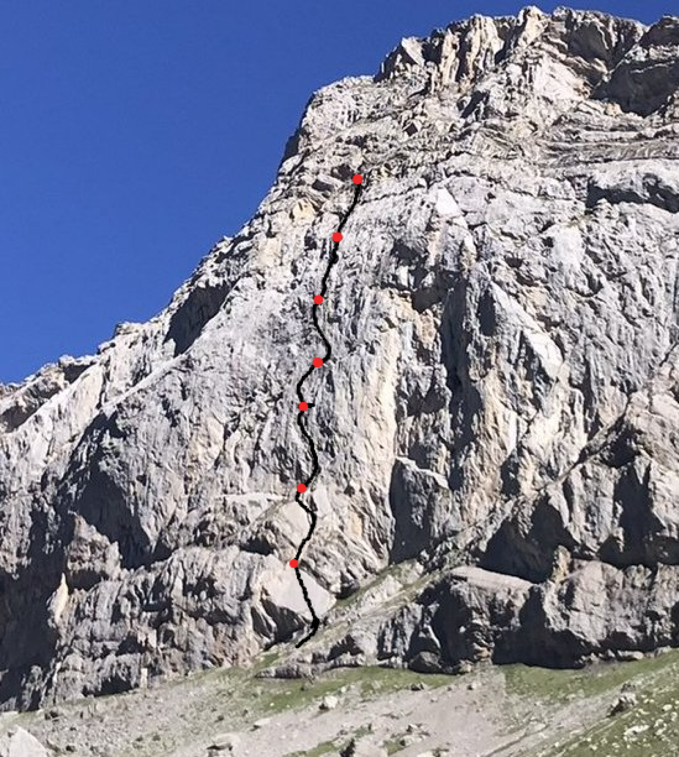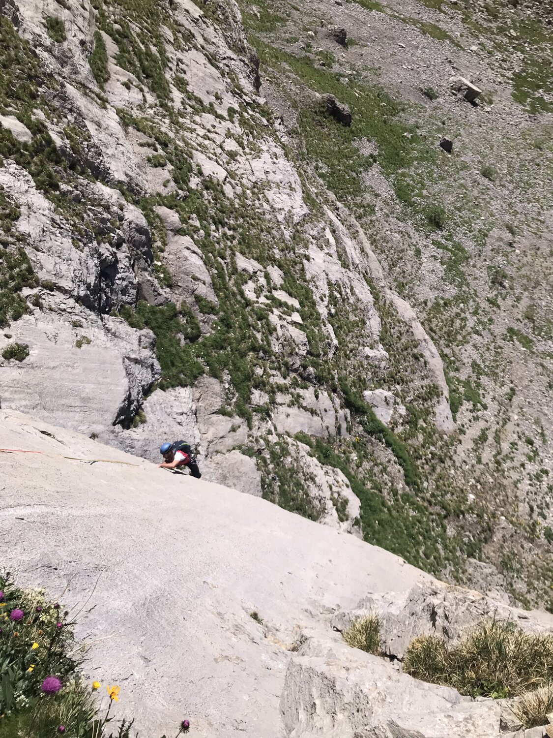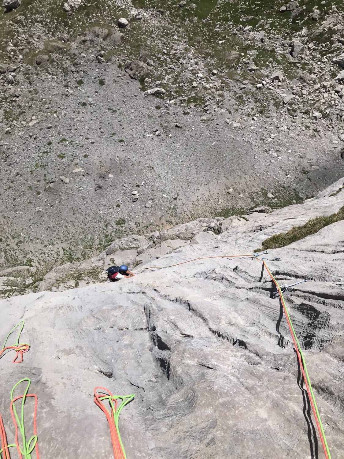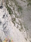 L4: Erst super fotogene Traverse zu kurzem schwereren Zug an kleinen griffen. Danach leichter an coolen Schlitzen. Zum Stand kleiner run out. Dieser ist auf einem Block, und weiter "rechts" als in unserem Topo gedacht. Wir dachten der Stand wäre relativ weit links bzw links vom alten Stand, aber an sich ist dieser fast gerade drüber.