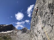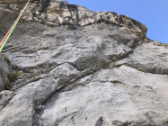 L1: Einfach über schuttiges Band bis zur Platte. Kurzer Aufsteher ist die Crux, jedoch direkt am Bolt. Danach noch einmal etwas über dem Bolt an super Seitgriffen und mittelmäßigen Tritten.