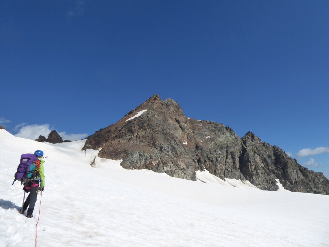 Der Firn auf dem Gletscher morgens gut begehbar, ab frühen Nachmittag sulzig. Gipfelaufbau schneefrei.