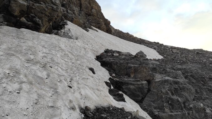 Bis zum Bützi normaler Wanderweg. Der Weg ab Bützi (in LK eingezeichnet) ist sehr gut (weiss-blau-weiss mit Pfosten) markiert, da dies der Abstieg aus dem Klettersteig über die Eggstöck ist. Kurz nach P.2263 muss man nach links abbiegen, auch dies ist mit weiss-blau-weiss markiert. Zuerst den vorhandenen Markierungen folgen, nach ca. 10-15 Minuten darf man jedoch nicht weiter den weiss-blau-weissen Markierungen folgen, da diese nach rechts und somit in die falsche Richtung folgen. Man folgt in diesem Karrenfeld leicht nach links und entfernt sich somit vom Hinter Eggstock. Links an einem gut sichtbaren Felskopf vorbei, kommt man zur Schäferhütte. Danach der Spur folgen, tendenziell immer schön auf der rechten Seite in der Nähe des Abgrundes, kommt man problemlos zum Firn. Nur noch wenige harmlose Schneefelder. Der Schnee ist auch auf dem Firn schon frühmorgens weich. Geht sehr gut im Auf- und Abstieg.