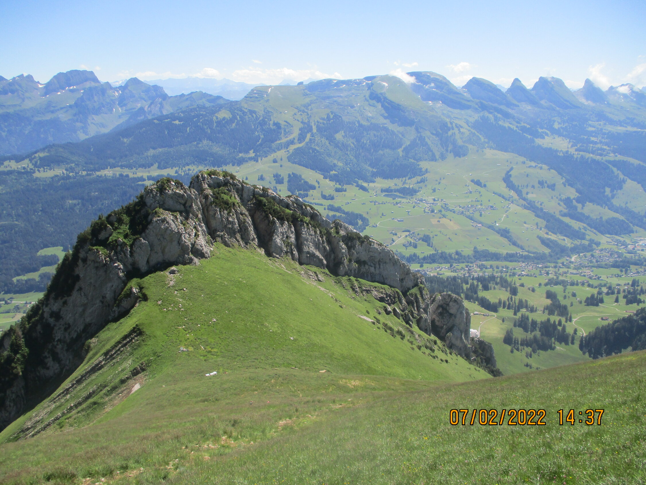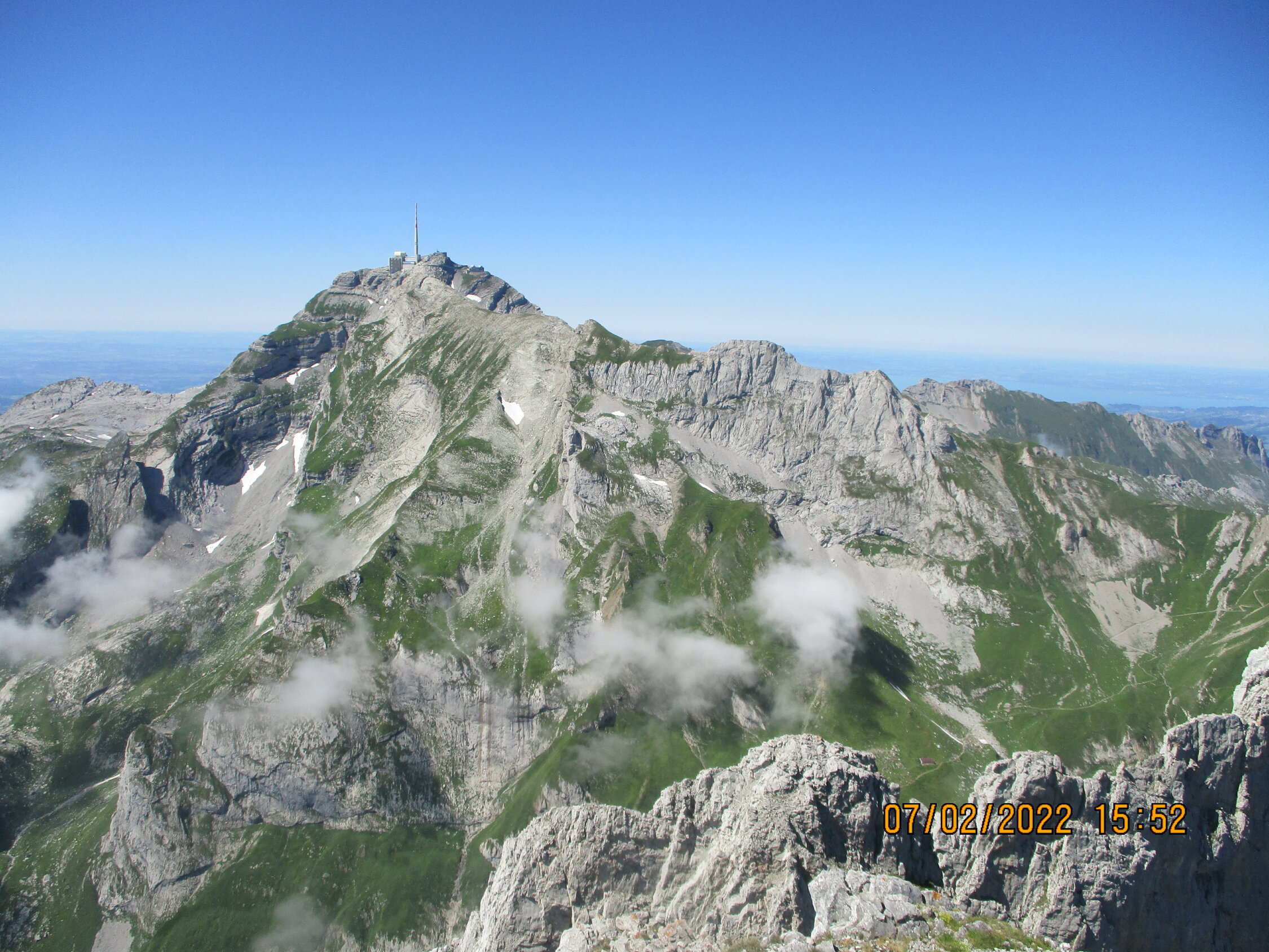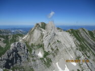 Nach Abseilen von der Kante haben wir noch den Fußaufstieg zum Schafberggipfel via Normalroute unter die Sohlen genommen. Heute exzellente Weitsichten, so klar habe ich den Bodensee vom Alpstein aus selten gesehen.