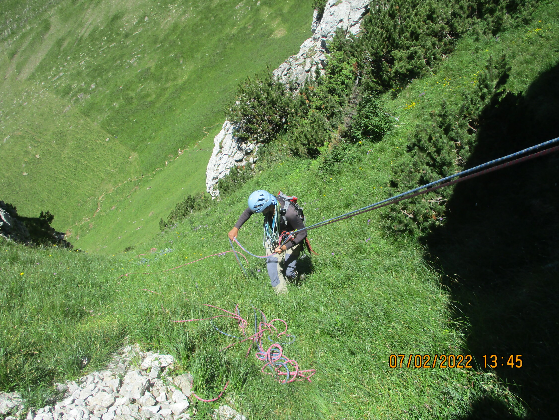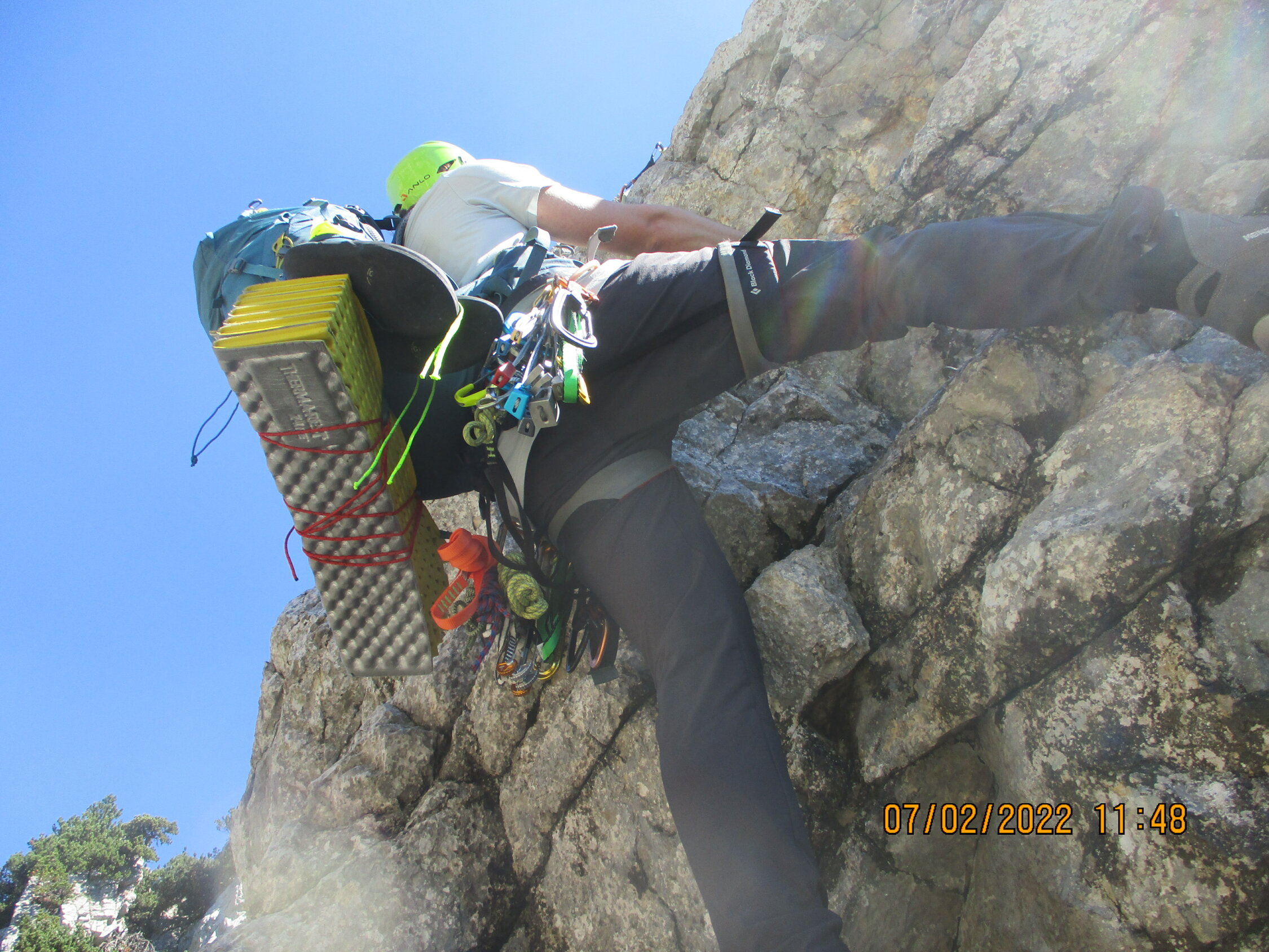 Ausgerechnet in der Schlüsselseillänge (5a 2 p.a. od. 5c+) war´s noch etwas nass. Mit etwas Überwindung machbar, sonst alles tiptop. Außer uns nach unserer Beobachtung drei weitere Seilschaften.