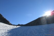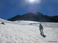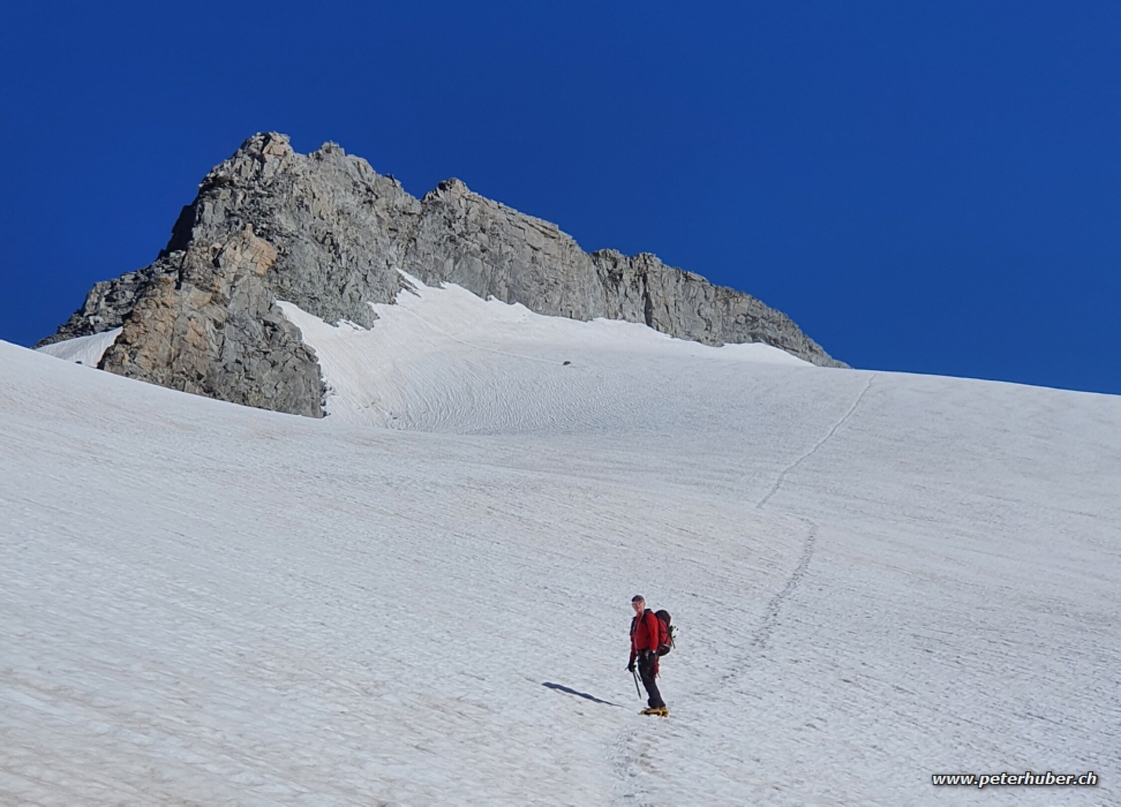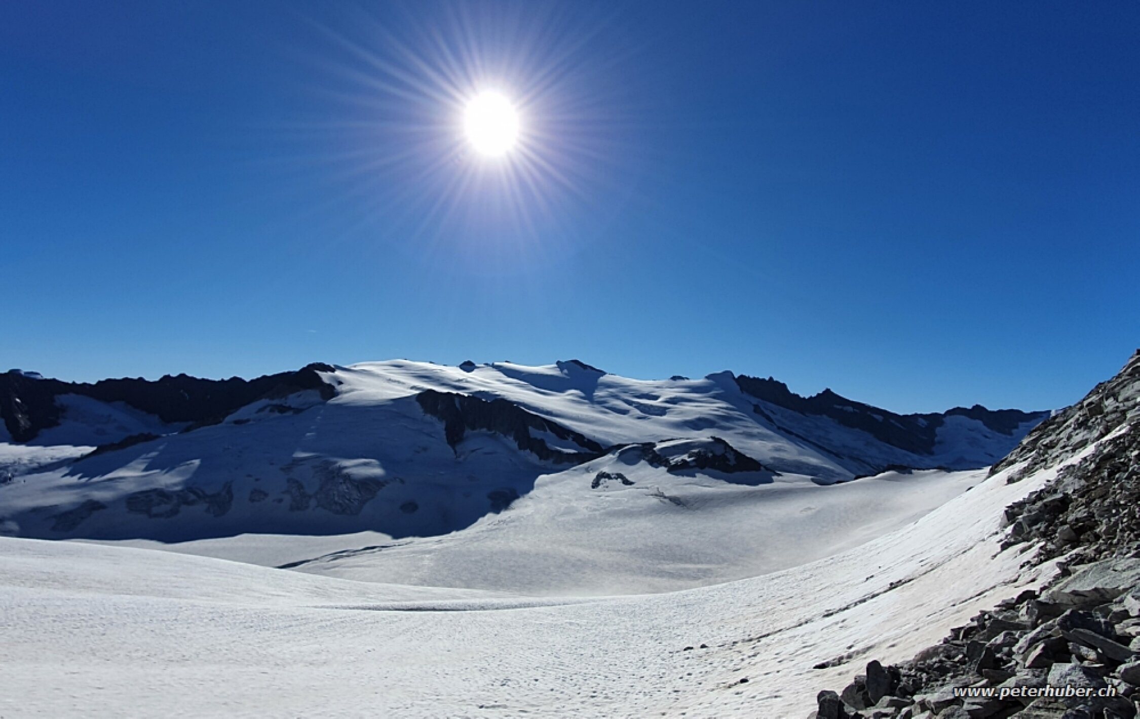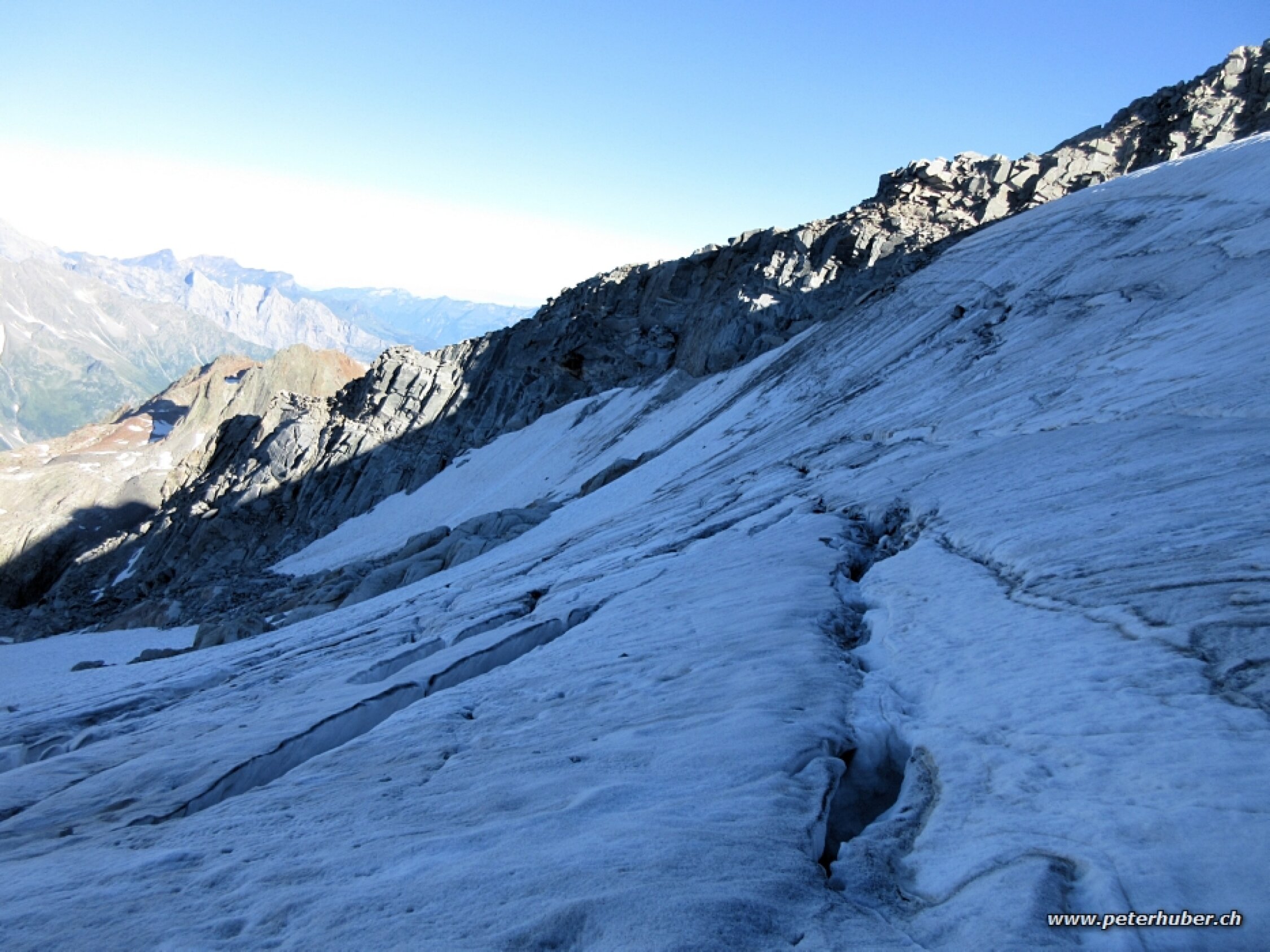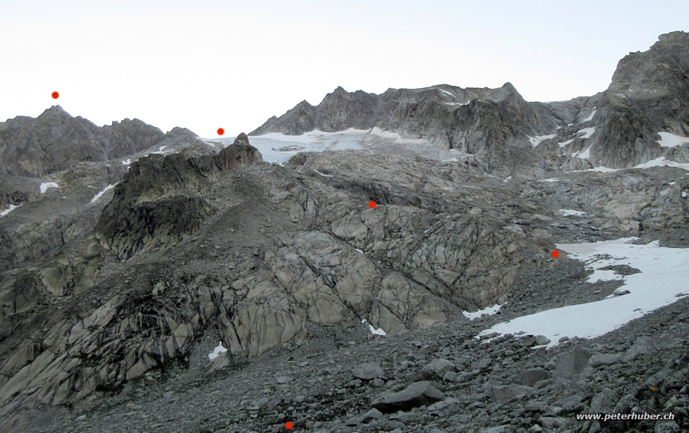 Am Samstag dann strahlend schön und warm. Der Aufstieg verläuft bis ca 2800 m entlang der roten Punkte über den Fels. Erst dann auf den unten zt blanken Gletscher. Oberhalb 3000 m hart gefrorener Schnee, sehr gut zu laufen mit Steigeisen. Es sind einige Spalten offen und gut erkennbar. Sie können problemlos überquert werden.