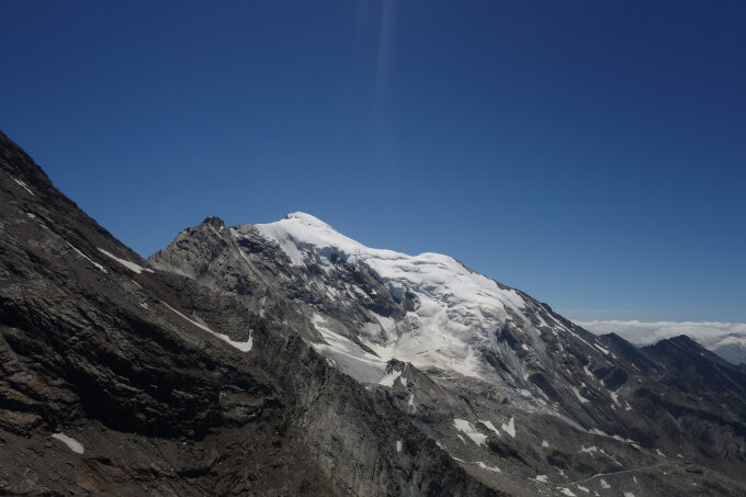 Beim kurzen Steilaufschwung zum Gipfel (3900m) sind die Tritte langsam eisig. Am Gipfel um ca. 10:00 - etwas windig aber tolle Rundumsicht. Im Abstieg um 10:30 immer wieder in Spaltennähe Schritt tief eingesunken. Ab dem 3. Mal treibts den Puls nicht mehr in die Höhe.