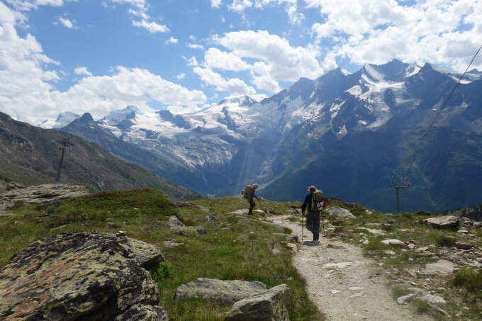 Start um 5:00 von der Weissmieshütte. Wanderweg hinter der Hohsashütte gefolgt um auf den oberen Teil vom Triftgletscher ca. (3250) zu kommen, da normaler Gletscherzustieg aper, spaltenreich und geröllig war.