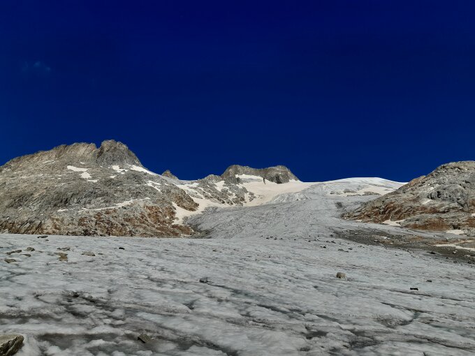 Bereits sehr stark ausgeappert und ziemlich bröselig und steinschlägig in der Einstiegsrinne. Haben uns daher auf dem Gletscher eher östlich gehalten. Für diese Jahreszeit viel zu wenig Schnee.