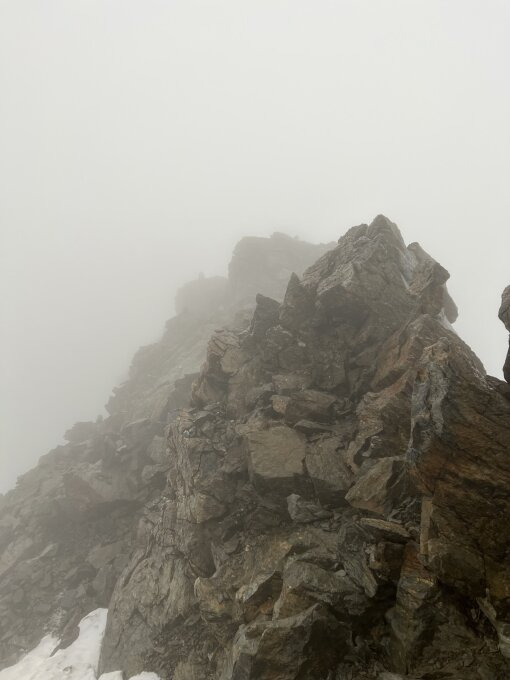Leider hat uns trotz sehr frühem Start (4 Uhr) eine Schneefront erreicht, welche uns zur Umkehr bewogen hat. Sonst momentan perfekte Bedingungen für einen 4000er in reiner Felstour! Schnee wird nach einem Sonnentag wohl wieder weg sein.