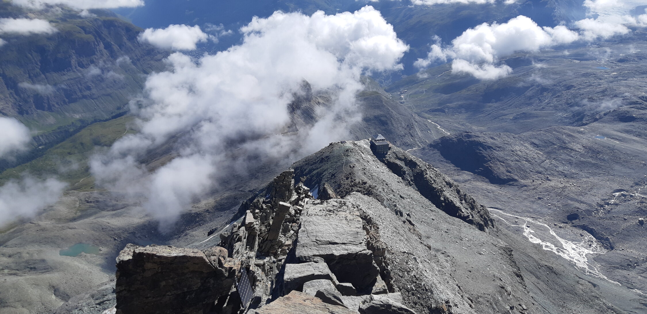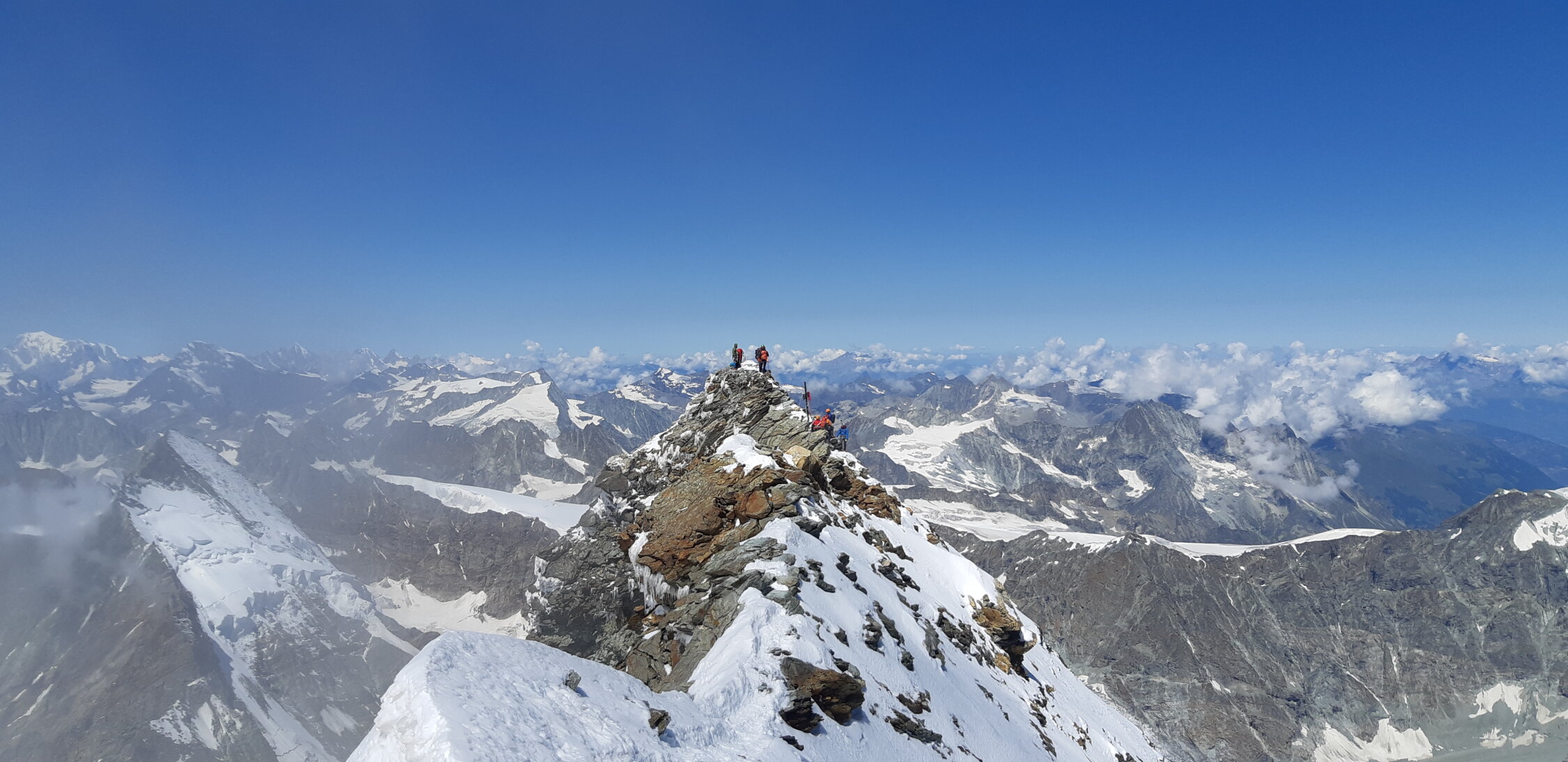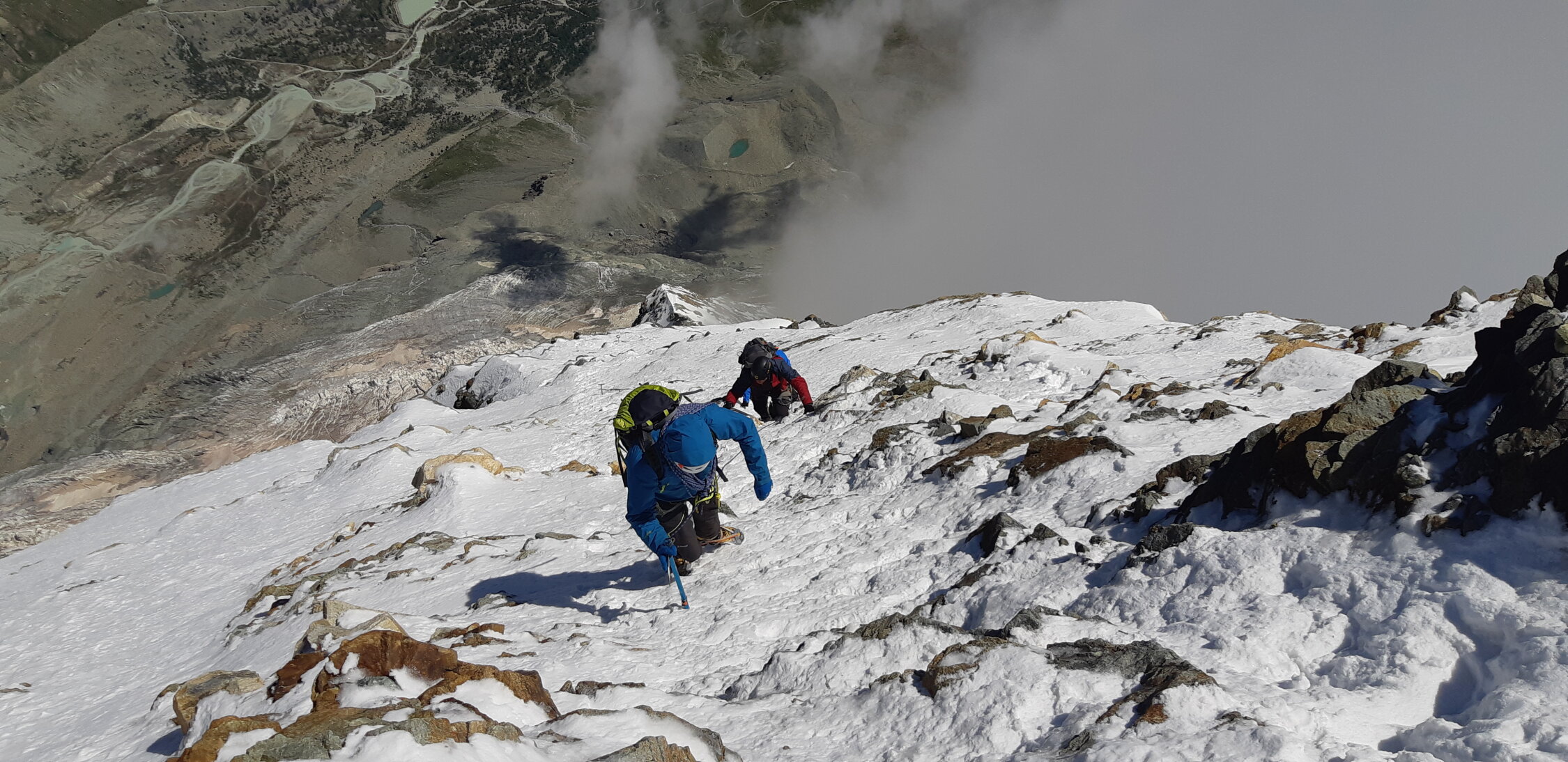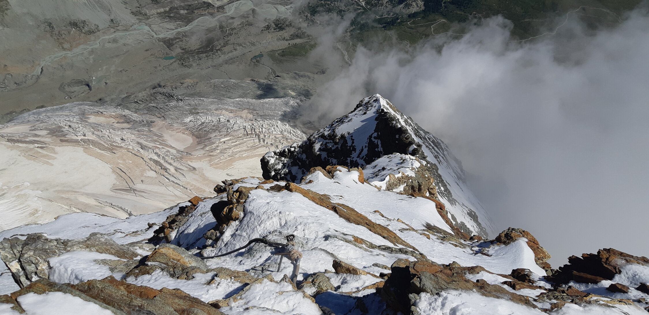 Top Verhältnisse. Fels trocken und warm. Steigeisen ab Fixseile. Gipfeldach hat gute Spur im guten Schnee.