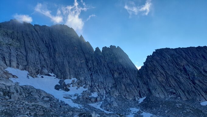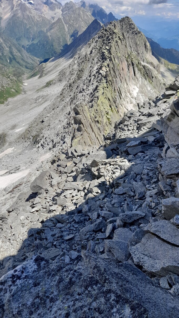 Wir sind über den Ostgrat abgestiegen. Die Abseilstelle war mit Steinmännchen gut zu finden.