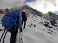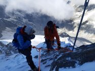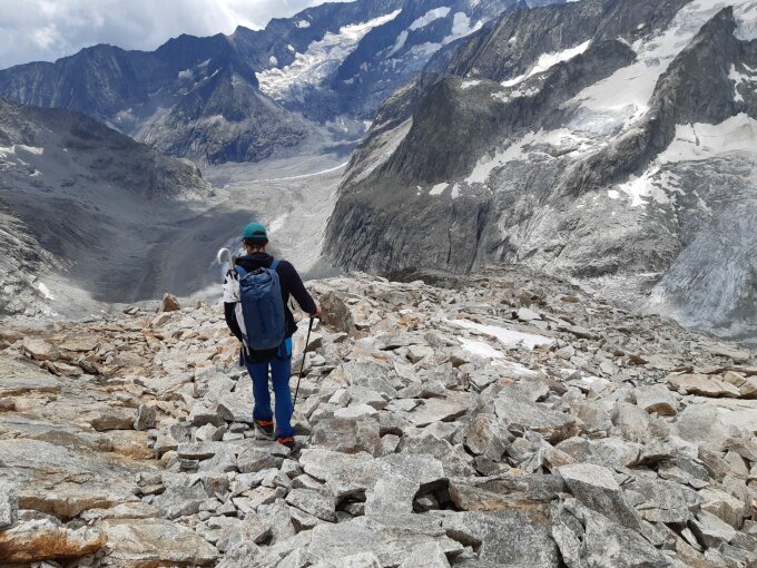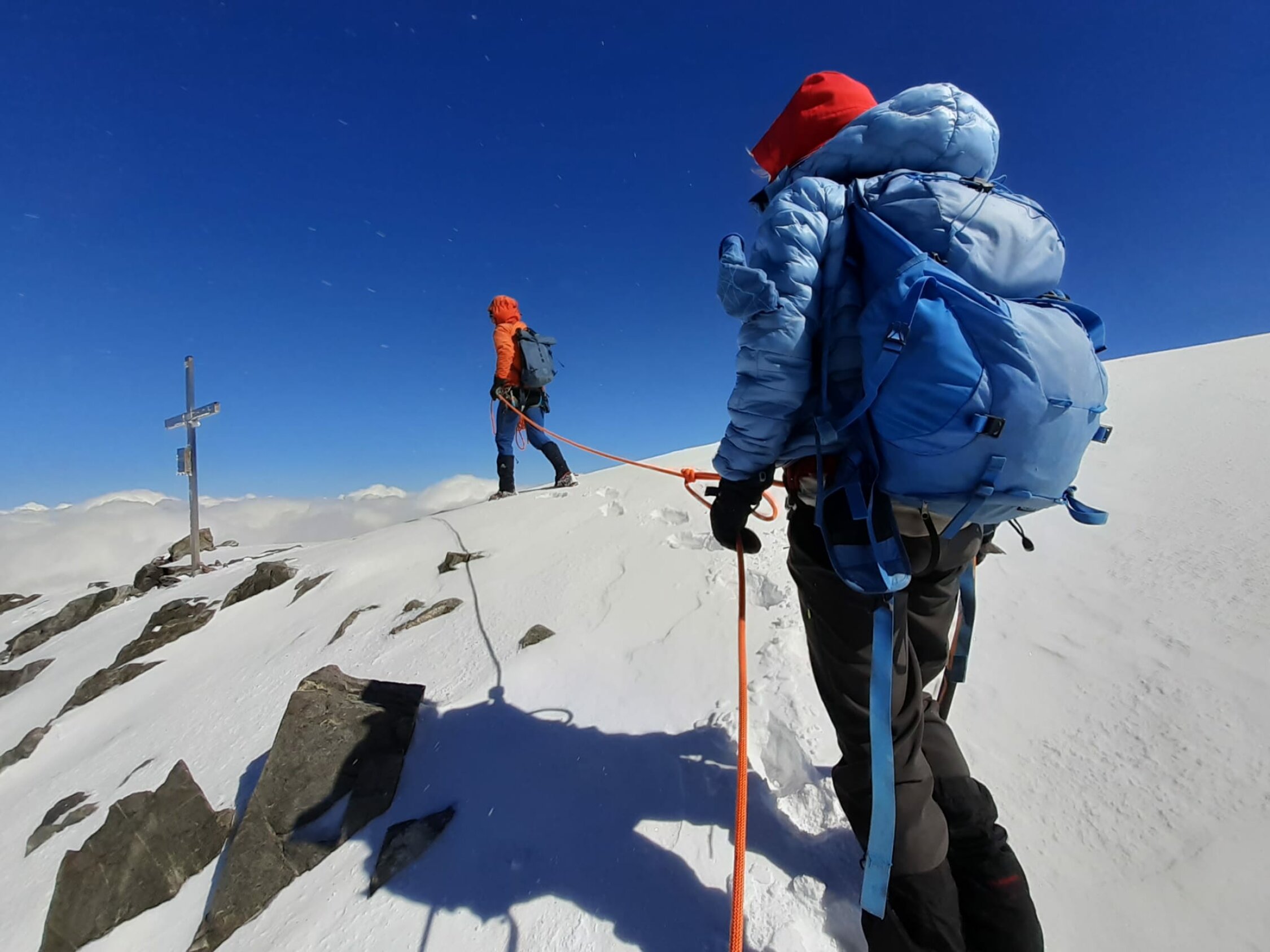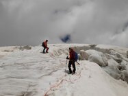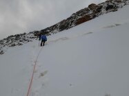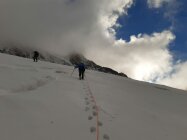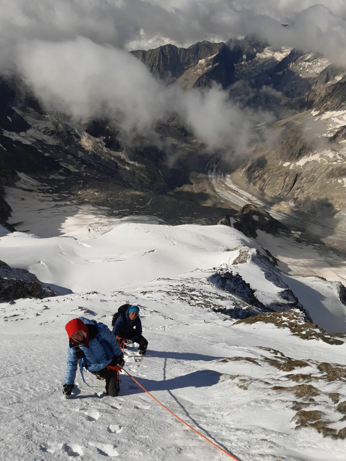 Bei bindfädenartigem Regen um 2.30 von der Hütte gestartet und die ersten 1.5 Std. dem mit Reflektoren gut markierten Weg entlang mit Regenschirm gewandert. Ab dem Blockgrat dann aufklarendes Wetter. Problemloser Übergang vom Blockgrat auf den Gletscher (kurze Steilstufe, aktuell keine Sicherung nötig). Der Gletscher in der ersten Hälfte leicht "sumpfig" vom nächtlichen Regen, im zweiten Teil dann ca. 10 cm Neuschneeauflage. Zu traversierende Spalten eher klein und gut sichtbar. Beim Übergang vom Gletscher auf den Fels sich leicht öffnender aber aktuell noch gut passierbarer Schrund. Bei etwas patagonischen aber interessanten Wetterverhältnissen dann weiter entlang den verschiedenen Couloirs und Rippen zum Gipfel (Sicherungsstangen alle 30-35m). In den Couloirs stellenweise wenig Triebschnee, im Gipfelbereich dann guten Trittfirn angetroffen.