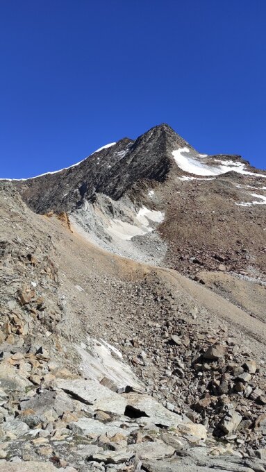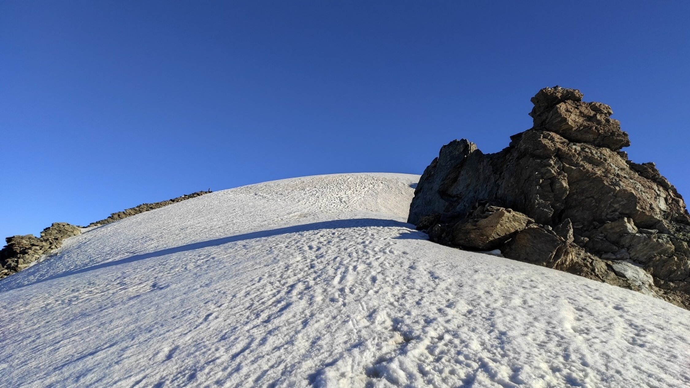 Vom Zwischbergenpass gibt es in Richtung Grat ein gut sichtbarer Pfad. Statt direkt auf den Grat empfiehlt es sich, rechts unter die Flanke zu halten und Richtung Firnfeld zu halten. Immer wieder findet sich eine gute Spur, ansonsten unschwierig über Feldblöcke. Das Firnfeld zu benutzen macht aktuell keinen Sinn mehr. Zu klein ist es geworden. Man spart auch durch Steigeisen an- und abziehen keine Zeit. Ausserdem sind hier im Verlaufe der Tour einige Steine aufs Firnfeld heruntergekommen. Hier geht man unmittelbar beim Anfang des Firnfeldes nach links unschwierig auf den Grat. Ab dort praktisch Gehgelände mit einigen Ier-Stellen. Ab ca. 3700 dann die Kraxelei im zweiten Grad.