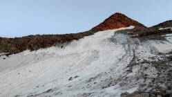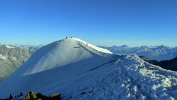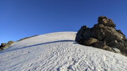 Ganzer Grat trocken. Erster Firnteil ganz oben ist nur noch kurz und kann ohne Steigeisen begangen werden, der Firn ist griffig. Für den Firn am Gipfelgrat haben wir Steigeisen angezogen, hat jedoch gute Spuren drin und könnte wohl auch ohne gemacht werden.