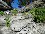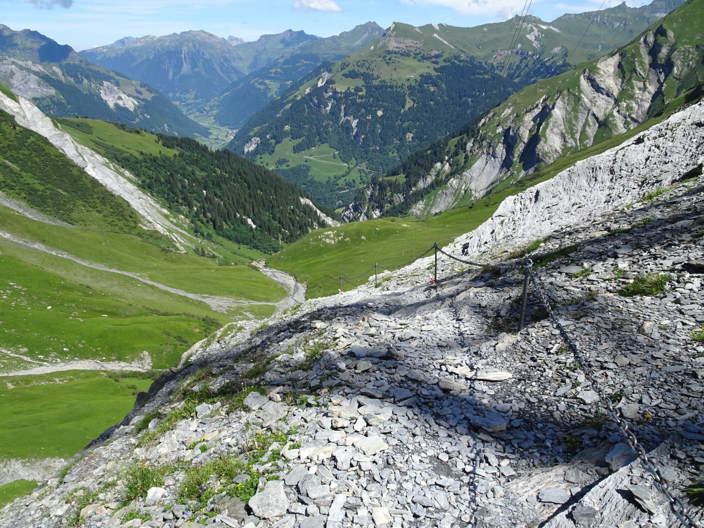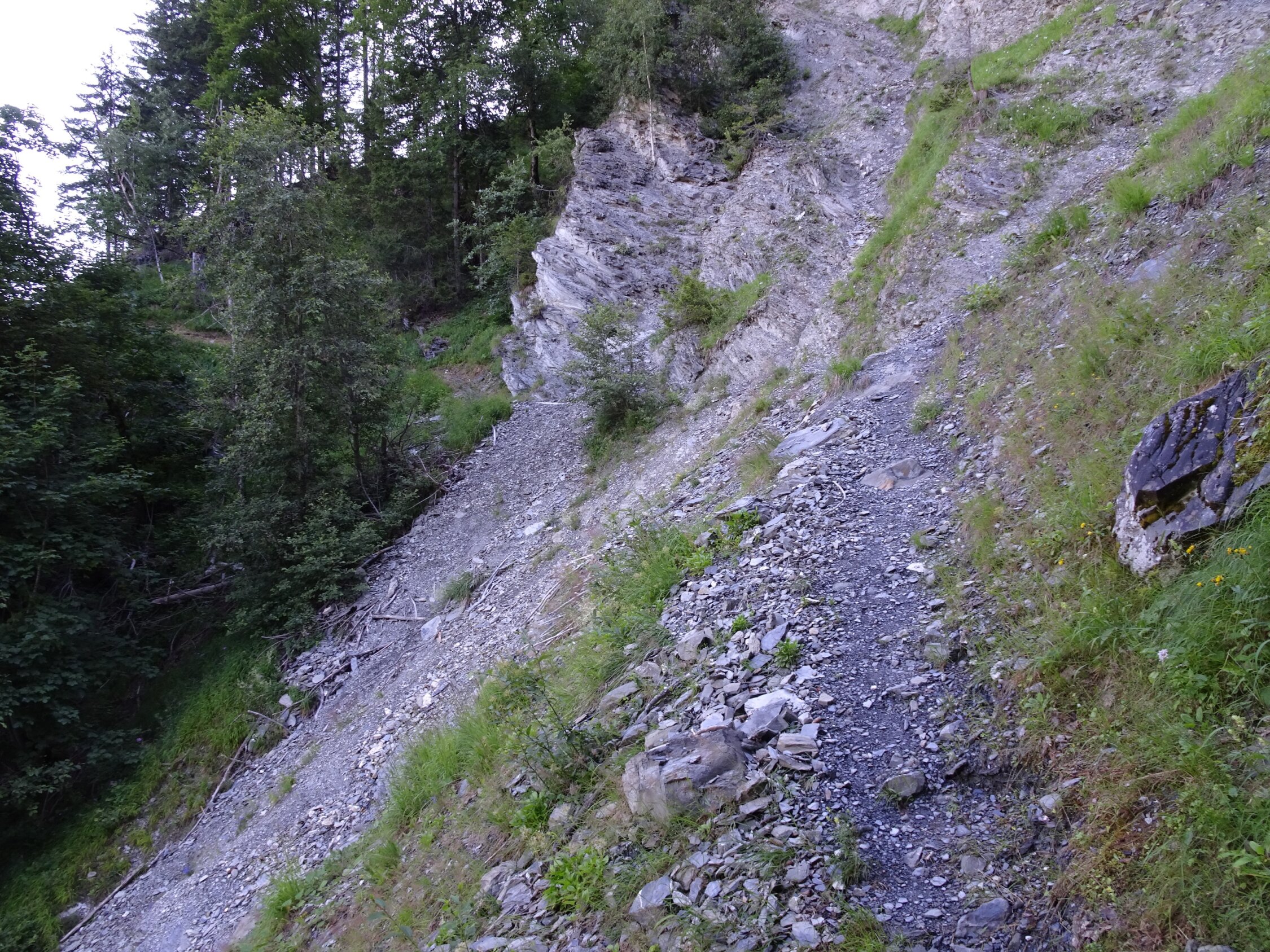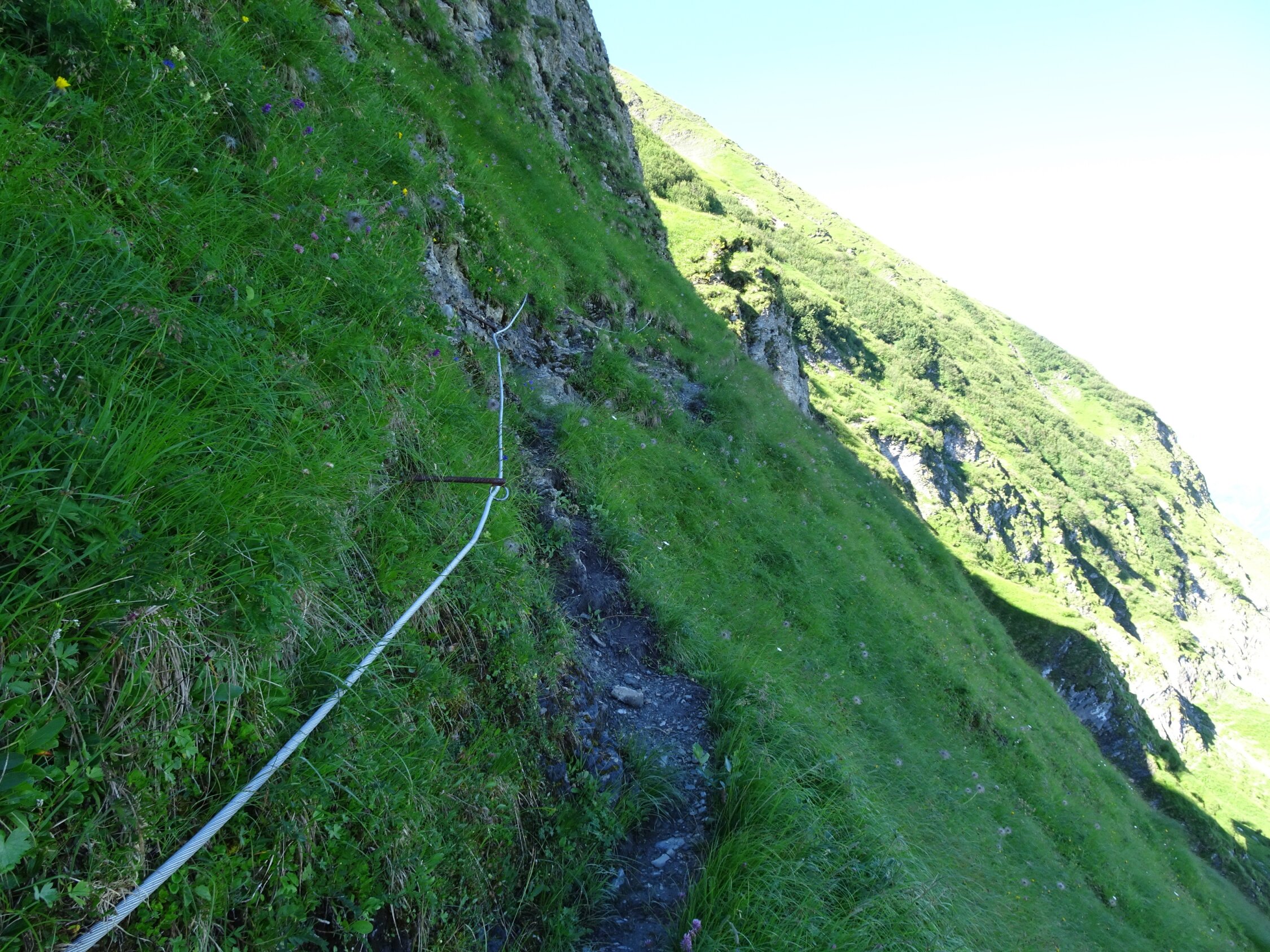 Wege am Morgen noch oft feucht-nass. An der Sonne rasch trocken. Der w-b-w markierte Weg über Gandstock und Mittaghorn war an manchen Passagen ziemlich feucht, aber Dank Seil- und Stiftsicherungen gut machbar. Abstieg zur Martinsmadhütte anfangs ziemlich bröselig; ab der Hütte schön trockenes T3-Gelände…