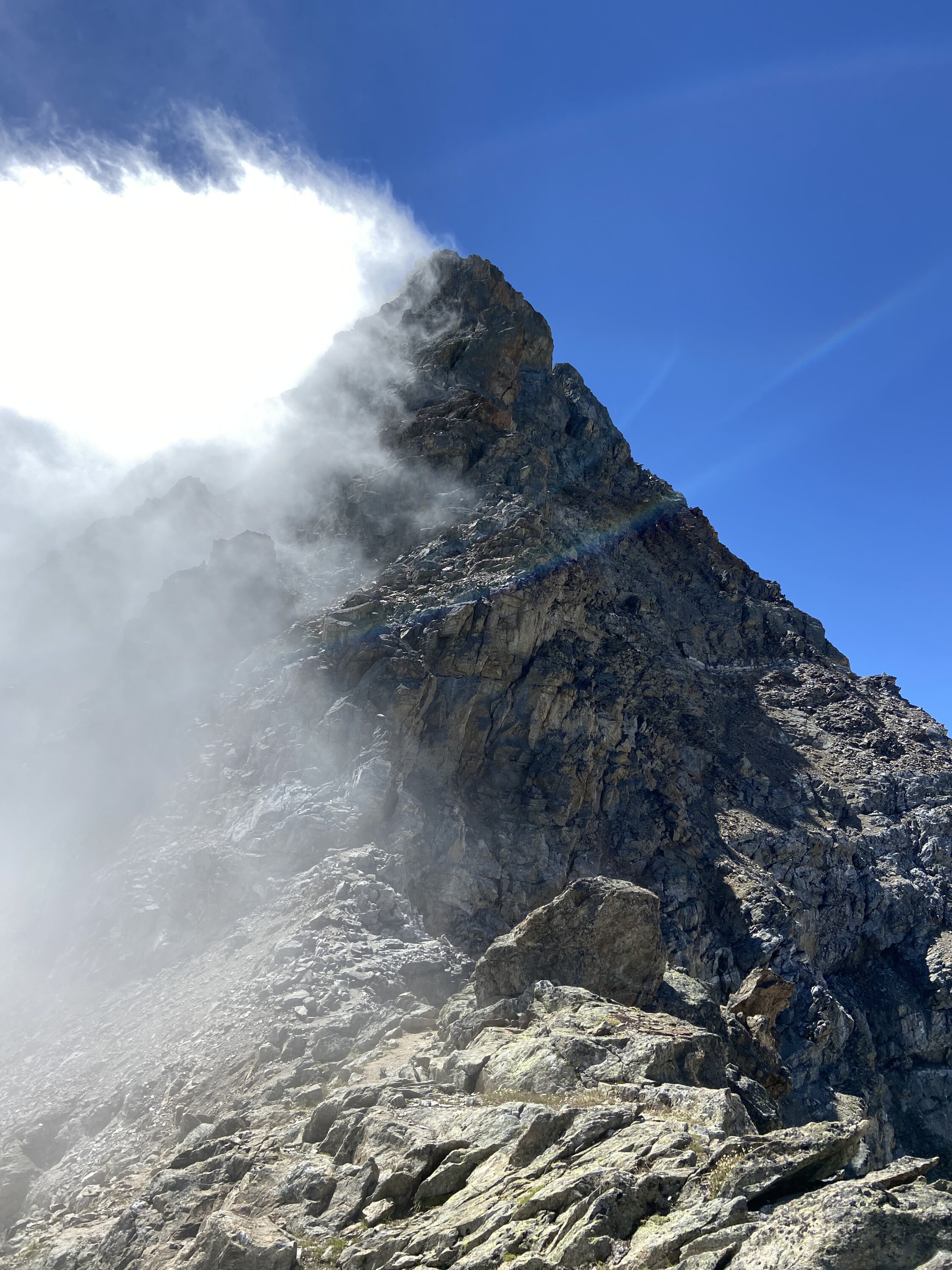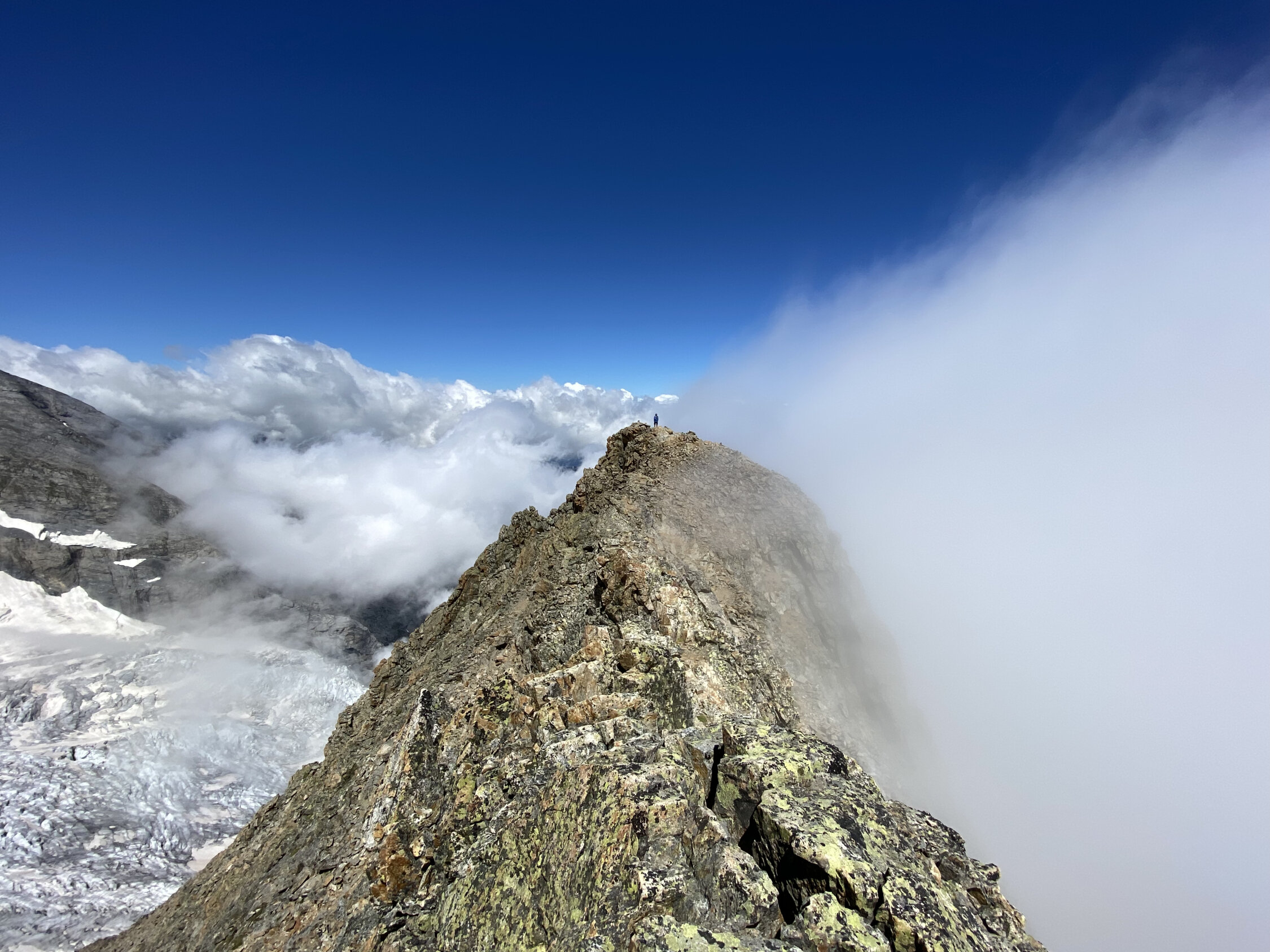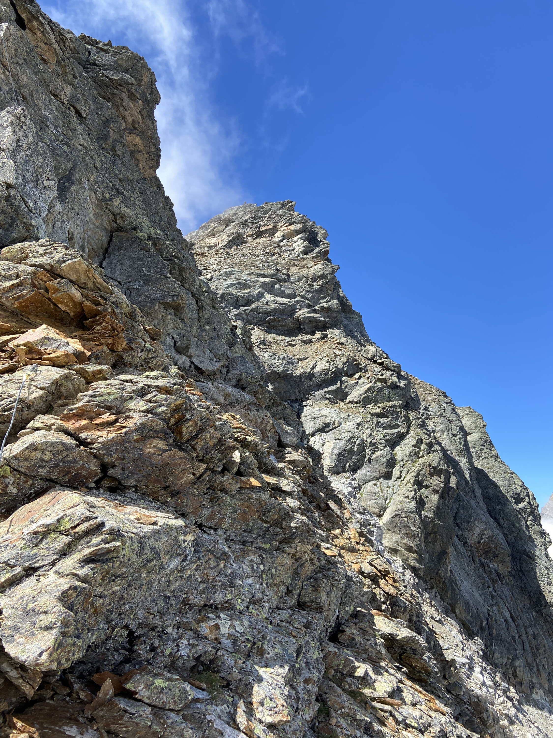 Der Tossengrat ist die logische Fortsetzung des Hüttenaufstiegs und wird mit jedem Meter allmählich schwieriger. Bis zum Tossensattel ist er auch üppig mit Fixseilen ausgestattet. Das richtige Abenteuer fängt erst 150m unter dem Gipfel an, wo keine Sicherungen mehr angebracht sind. Eine schöne Kletterei im 2. und 3. Grad öffnet sich einem bis zum Gipfel. Die Wegführung ist logisch und oft mit weissen Punkten oder Steinmännern gekennzeichnet.