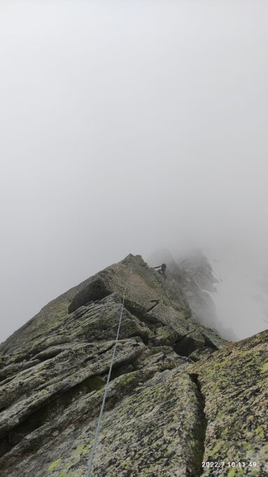 Grat: Nach den ersten zwei SL kletterten wir in Wechselführung von Stand zu Stand und lassen eine von zwei Seilschaften, die wir an diesem Tag antreffen, passieren. In der 4b-Seillänge empfiehlt es sich, eher links in der Verschneidung zu bleiben - die Risse ziehen einen nach rechts, aber da wird es schwieriger. Ausserdem habe ich den Stand zwischen 5. und 6. SL übersehen (er liegt rechts des Grats, ich bin direkt auf dem Grat bzw. leicht links geblieben). Besonders spektakulär fand ich die 7. und 8. SL - da gibt es eindrückliche Tiefblicke! Da wir nach der 8. SL unsere Umkehrzeit erreicht hatten, haben wir kaum 50m vor dem Gipfel entschieden, abzusteigen.