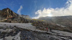 Abstieg: Zuerst queren wir vom Grat nach links zur Abstiegsroute (T5+/WS+). Sie holt zuerst nach rechts aus, und geht dann stets linkerhand, den blauen Punkten nach. Der Abstiegsroute lässt sich zur Zeit gut folgen, wir hatten keine Probleme, die Abseilstände zu finden. Das Firnfeld unter der Abseilpiste war zwar angetaut, aber unangenehm rutschig, weswegen wir die Steigeisen anlegen. Wir folgen den Wegspuren, die leicht nach links ziehen, doch irgendwann verlieren diese sich. Ab hier bis auf den Gletscher haben wir für knapp 200hm 1.5h benötigt - wir wollten hinüber in Richtung der Strahlerstelle, doch haben wohl nicht den optimalen Weg erwischt. Letztendlich war unsere Aufstiegsroute deutlich besser.