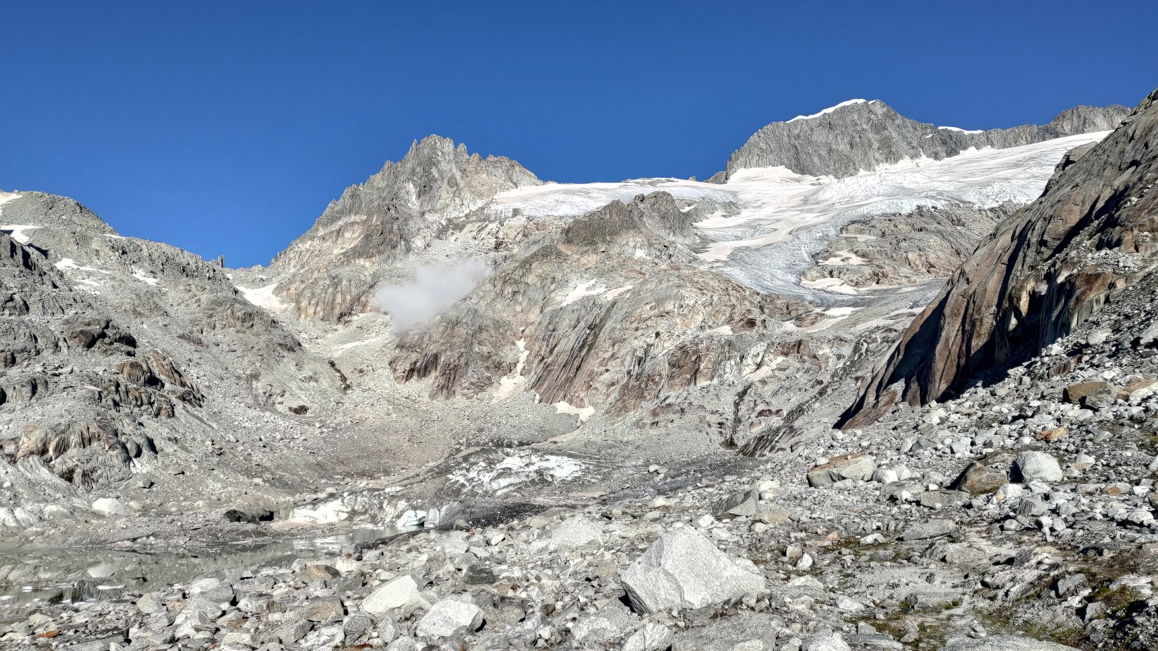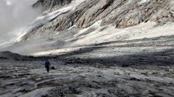 Zustieg: Zuerst zogen wir in Richtung des direkten Zustiegs auf den Tiefengletscher. Dieser ist jedoch nicht mehr begehbar, weswegen wir recht direkt von Südosten zu P.2714 hinaufgingen. Dort gab es zu Beginn noch Wegspuren und Steinmandlern, später nicht mehr. Von P.2714 gelangt man über die Schwemmebene problemlos zurück zur normalen Wegspur und dann auf den Gletscher (T4).