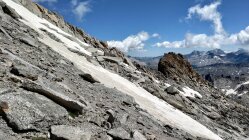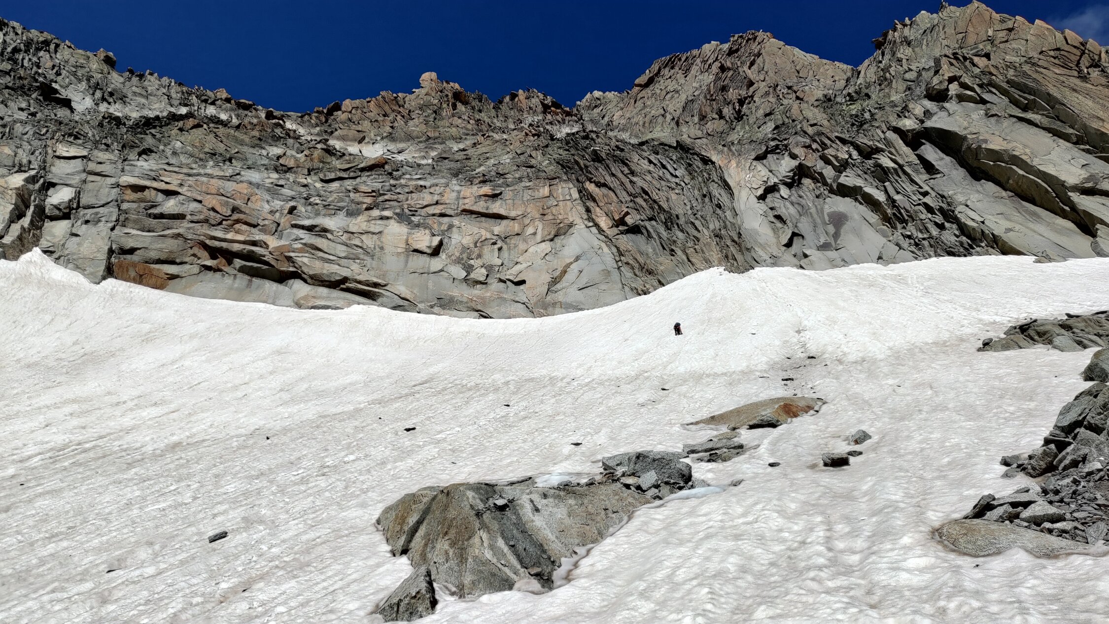 Der Gletscher ist fast komplett aper, liess sich aber im flachen Teil ohne Steigeisen begehen. Auf etwa 2.900m haben wir auf zwei weitere Seilschaften aufgeschlossen, ziehen wie diese die Steigeisen an und folgen ihnen nach kurzen Austausch zur nördlichsten Eiszunge auf knapp 3.000m. Dort ist der Übergang in den Fels allerdings schwierig, weswegen wir etwa 50m absteigen und von der mittleren Eiszunge aus durch den plattigen Fels nach oben bis zum Firnfeld unterhalb des Grates ziehen (WS/T5, Stellen II).