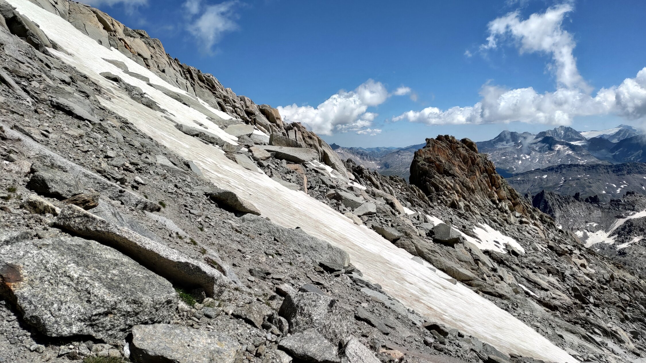Der Gletscher lässt sich inzwischen ohne Steigeisen begehen, und so gelangen wir zurück zum P.2765, wo wir nochmal rasten. Danach folgen wir den gut sichtbaren Pfad. In der Steilstufe bei etwa 2.650m wartet aber noch eine unangenehme Überraschung: eine plattige, exponierte Stelle (T5+). Das war die einzige Stelle an diesem Tag, die mir mental Probleme bereitet hat. Sie liesse sich aber auch umgehen, wenn man nicht der Wegspur folgt, sondern oberhalb der Stufe etwa 100m nach Norden geht. Dort findet sich ein leicht ausgeprägtes Kar, welches ebenfalls hinab zum Weg führt.