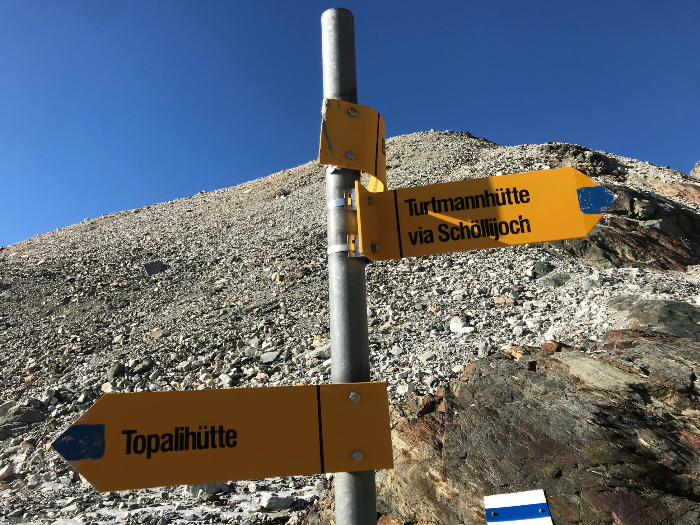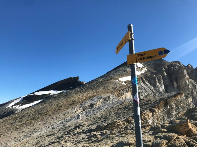 Der Weg von der Topalihütte bis zum Schöligletscher und über diesen rechtshaltend bis zum Einstieg zum kurzen Klettersteig ist gut zu finden.