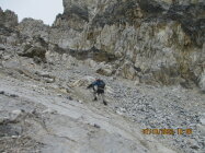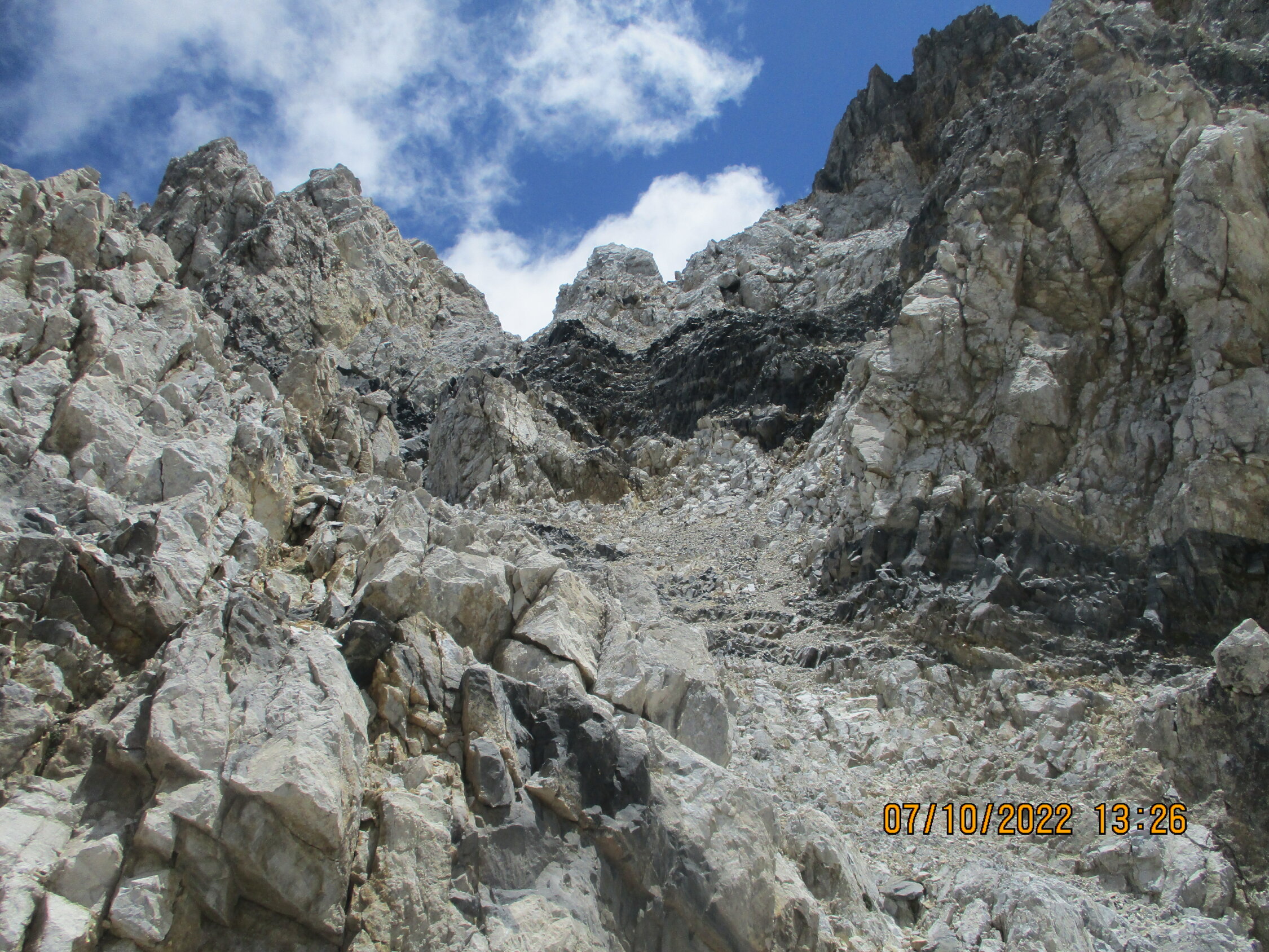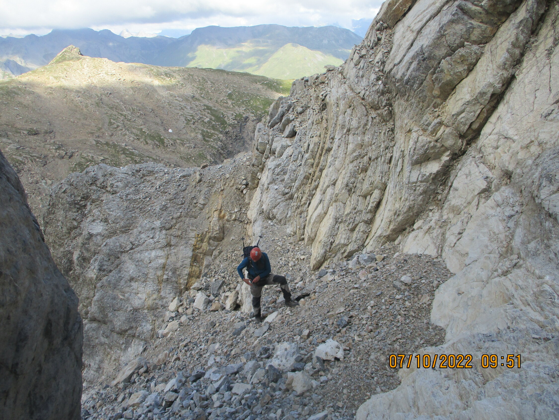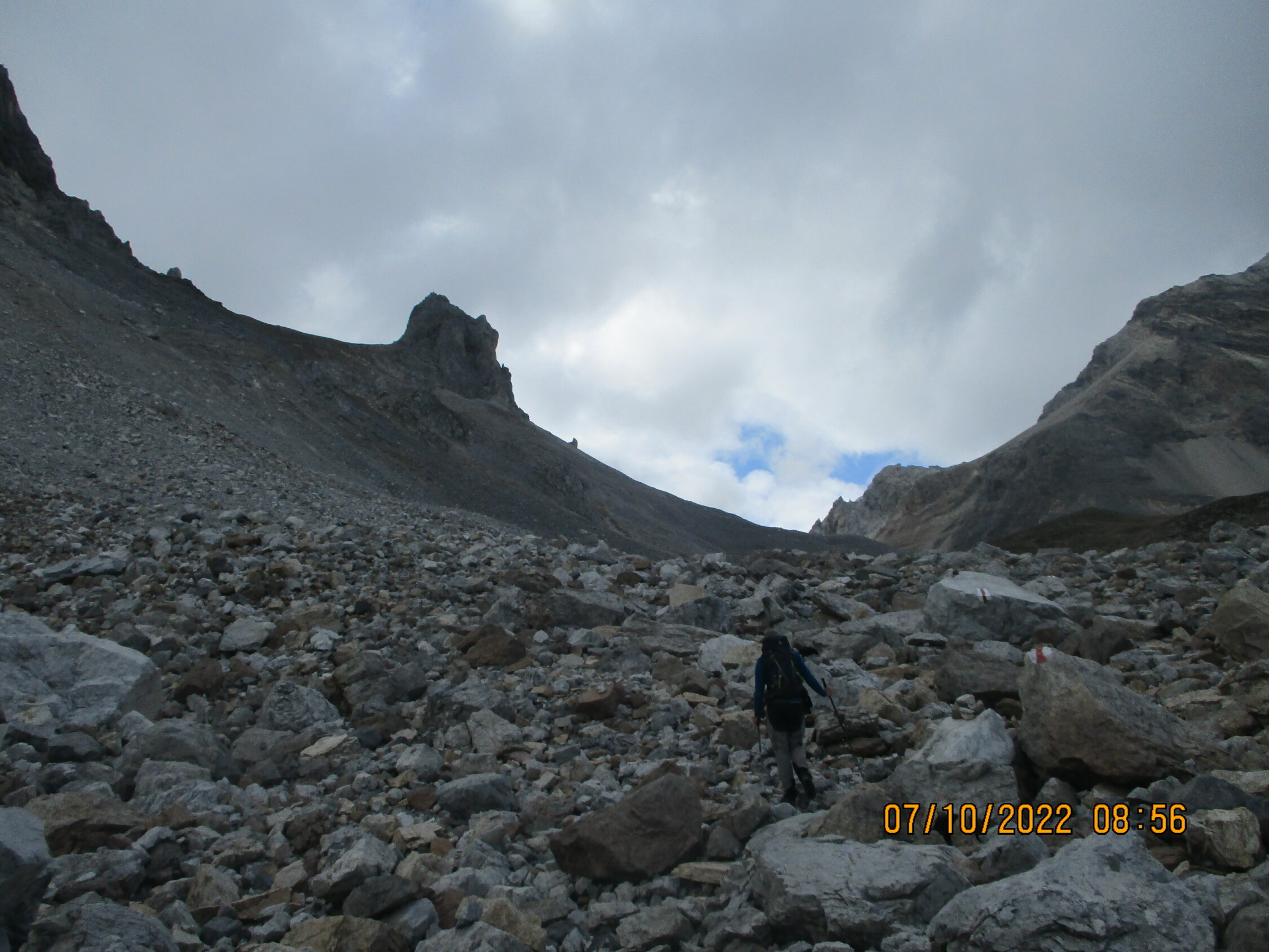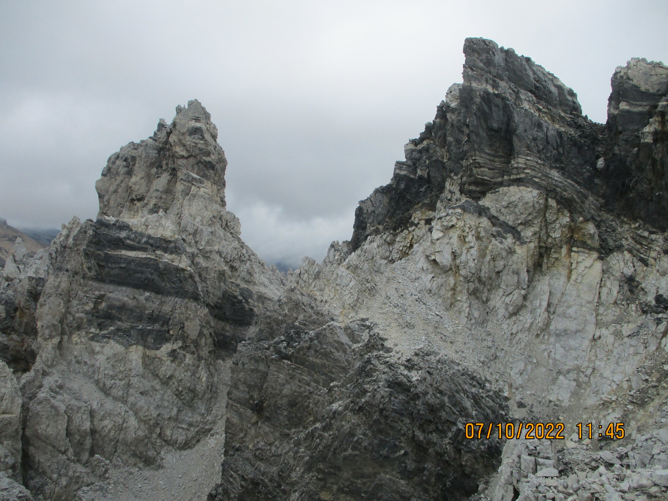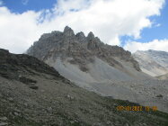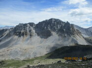 Alles trocken und schneefrei. Starker Wind und für die Jahreszeit ungewöhnlich kühl."Machbar" deshalb, weil ich der Meinung bin, dass man sich sehr gut überlegen sollte, diese Tour zu unternehmen. Die Brüchigkeit der Felsen und die Steinschlaggefahr sind enorm. Auch wenn man sicher ist, dass keine weiteren Begeher in der Tour unterwegs sind, kann etwa die Anwesenheit von Steinböcken im Bereich der Route lebensgefährlich werden. Wir hatten Glück, beides war nicht der Fall. Wir waren seilfrei unterwegs.Seilsicherung in der schwarzfarbenen Rinne (im SAC-Führer auch als "seichter Graben" bezeichnet) wäre aufgrund der Ausgesetztheit dort wünschenswert gewesen. Doch wo Sichern in diesem brüchigen Gelände? Eventuell könnte auch ein Pickel zum Stützen und provisorischem Sichern von Nutzen sein. Unverzichtbar ist jedoch der Steinschlaghelm.
