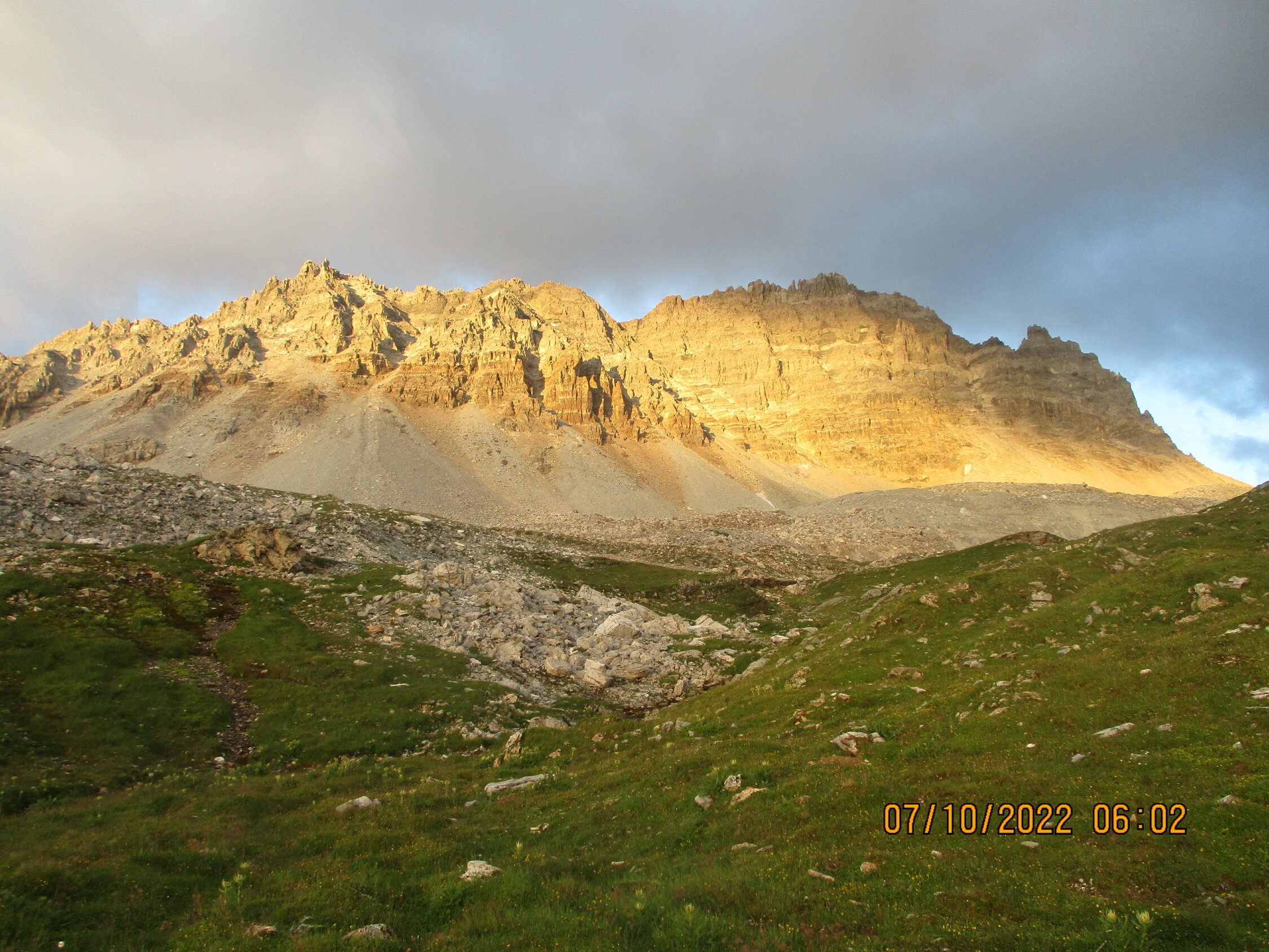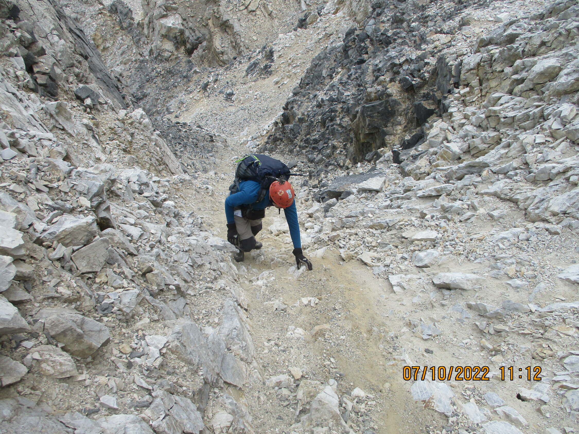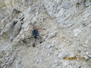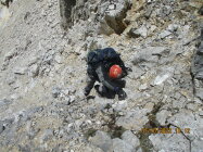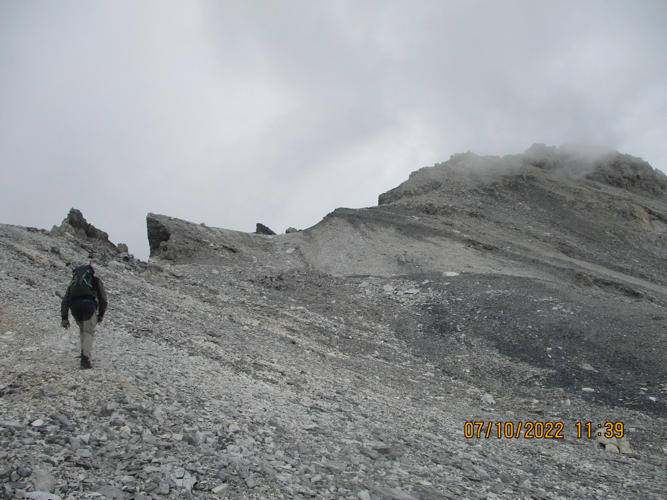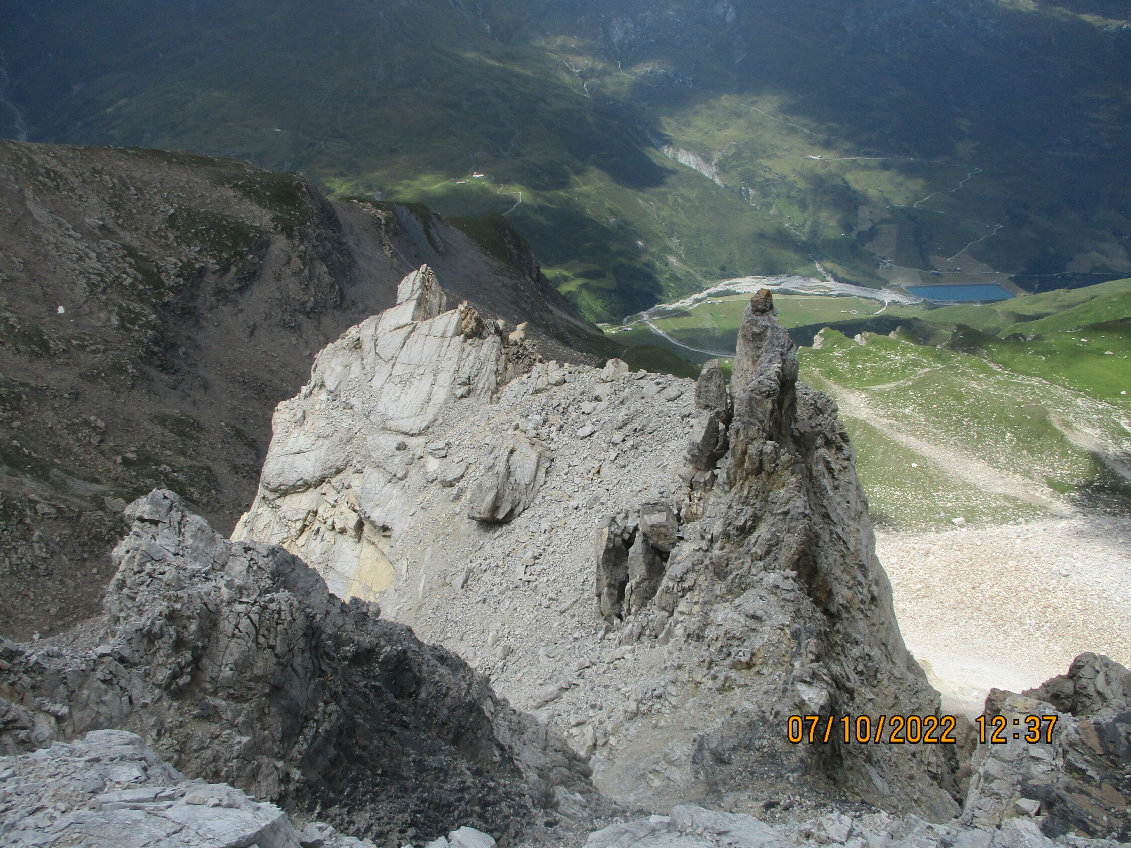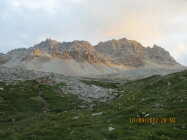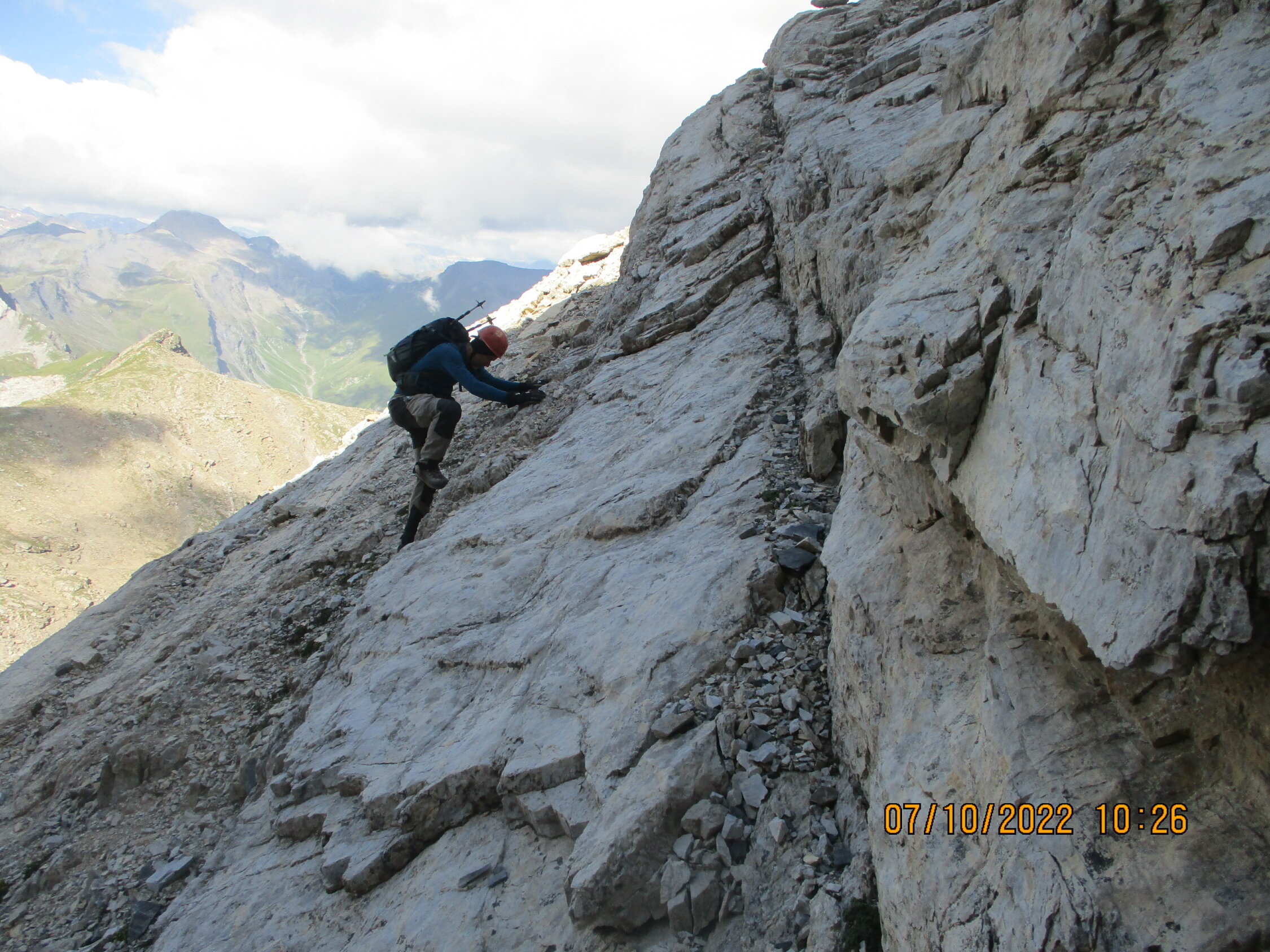 Alles trocken und schneefrei. Starker Wind und für die Jahreszeit ungewöhnlich kühl."Machbar" deshalb, weil ich der Meinung bin, dass man sich sehr gut überlegen sollte, diese Tour zu unternehmen. Die Brüchigkeit der Felsen und die Steinschlaggefahr sind enorm. Auch wenn man sicher ist, dass keine weiteren Begeher in der Tour unterwegs sind, kann etwa die Anwesenheit von Steinböcken im Bereich der Route lebensgefährlich werden. Wir hatten Glück, beides war nicht der Fall. Wir waren seilfrei unterwegs.Seilsicherung in der schwarzfarbenen Rinne (im SAC-Führer auch als "seichter Graben" bezeichnet) wäre aufgrund der Ausgesetztheit dort wünschenswert gewesen. Doch wo Sichern in diesem brüchigen Gelände? Eventuell könnte auch ein Pickel zum Stützen und provisorischem Sichern von Nutzen sein. Unverzichtbar ist jedoch der Steinschlaghelm.