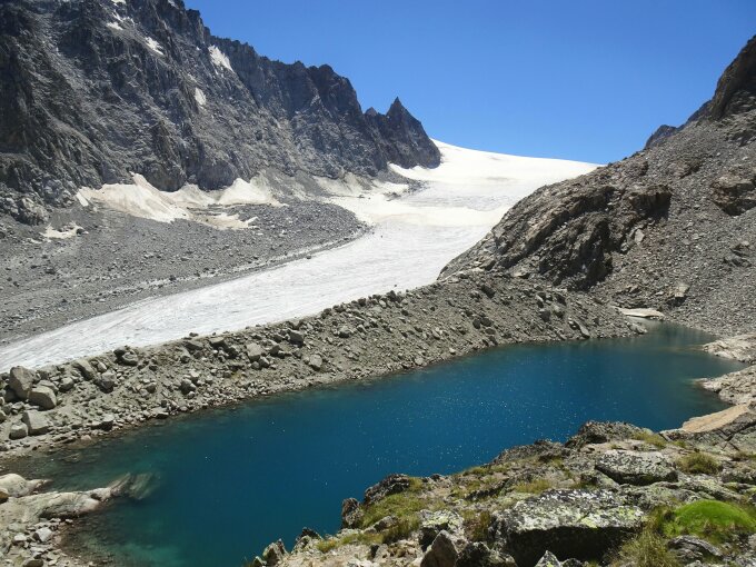 Der markierte Hüttenzustieg führt ab der Cabane d´Orny oberhalb des Gletschers, teils gesichert, über Felsen und Geröll zur Cabane du Trient. Im Abstieg sind wir wie viele andere dann direkt über den Glacier d´Orny gegangen. Gletscher weitgehend aper, die Spaltenzone überwindet man ganz links (Abstiegsrichtung).