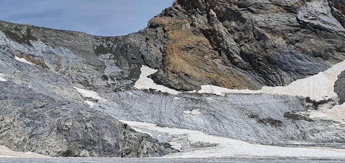 Gletscher noch teilweise schneebedeckt. Brücken halten noch. Spalten sollten nicht unterschätzt werden. Bergschrund muss im Fels umgangen werden. Abseilstelle eingerichtet.