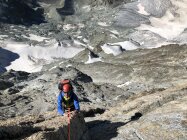- Zuerst gilt es, den Pfeiler *rechts* des grossen Schneefeldes anzupeilen (nicht im Schneefeld hoch, sondern wirklich horizontal rüberqueren. Siehe Foto mit der Verschneidung.