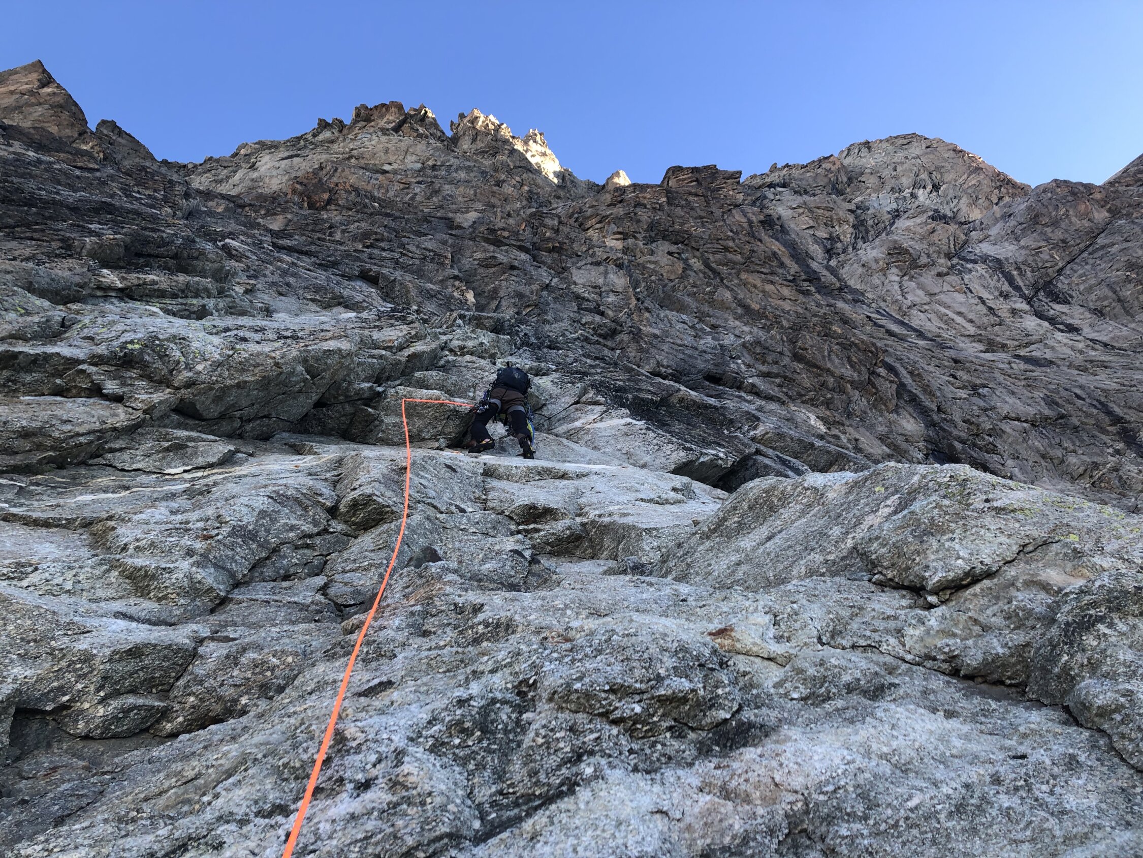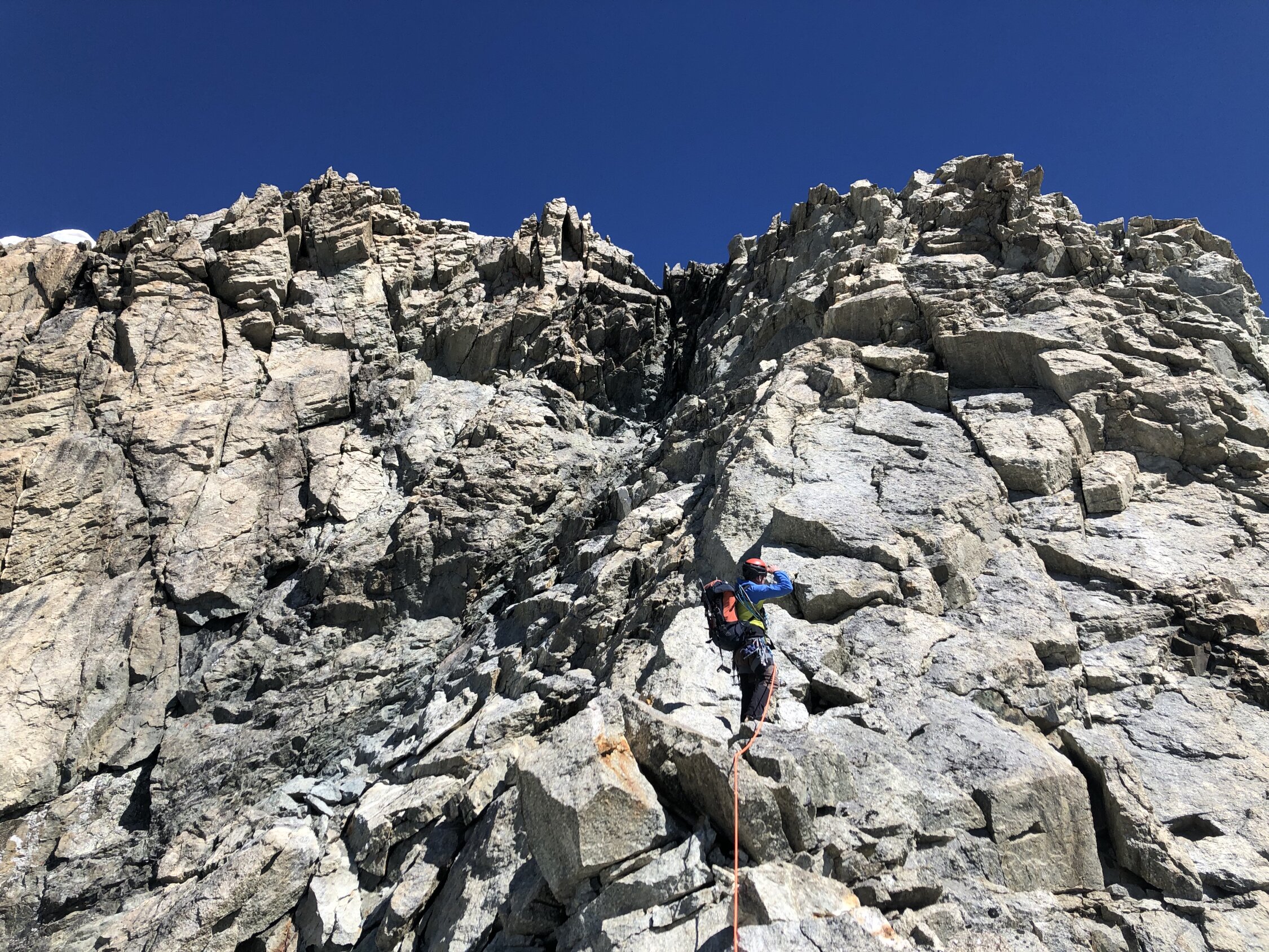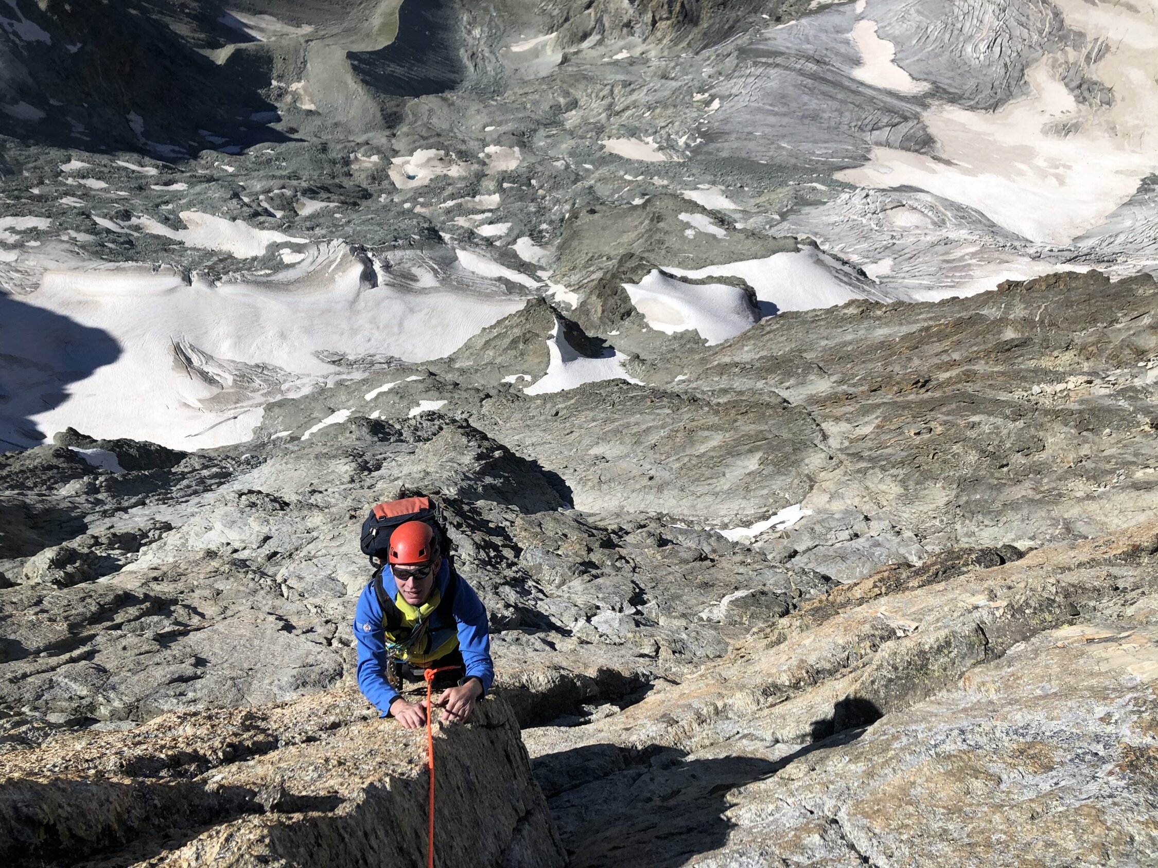 Mir hat die Südwand sehr gut gefallen, lässige Kletterei in gutem Fels. Das Highlight ist der gelbe Pfeiler gleich unter dem Kohlenband. Wir haben dort die im Tibbets "Alpenglow"-Buch erwähnte direkte Variante geklettert, welche gleich rechts von dem markanten Quarzband hochgeht. Es sind zwei recht anspruchsvolle SL (25m 5b + 35m 5b), vollständig clean, in wirklich bestem Fels, mit super Tiefblick über die gesamte Wand. Einfacher (aber wohl auch weniger lohnend) lässt sich der gelbe Pfeiler über dessen linke Kante erklettern.