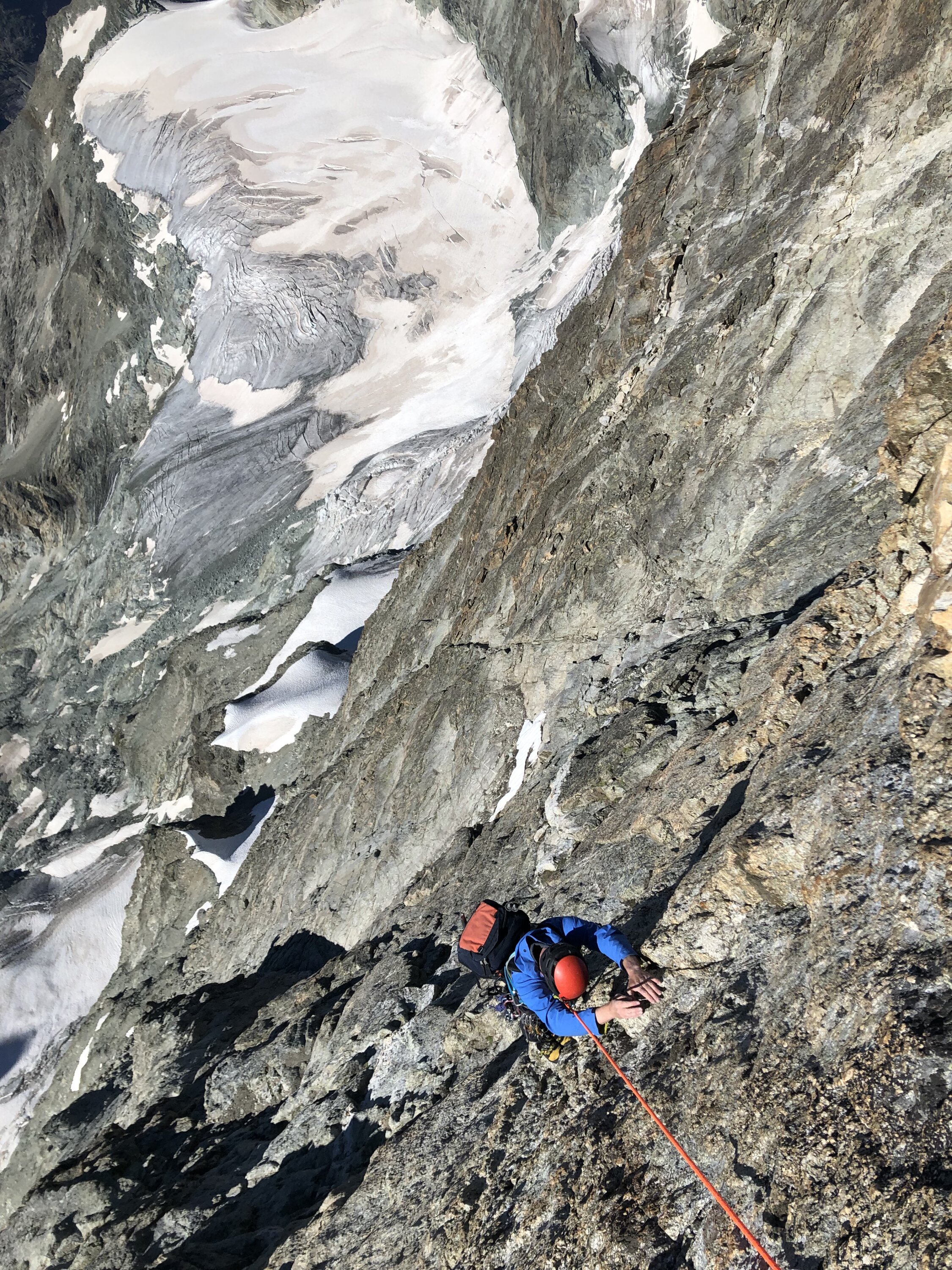 Die Wand erhält auch im Hochsommer erst so gegen 9 Uhr Sonne. Wir sind um 4:45 los, Beginn Kletterei 6 Uhr, Beginn Gelber Pfeiler 8:45 Uhr, Kohlenband 9:30, Gipfel 10:40. Wellenkuppe um 13 Uhr, Rothornhütte um 15 Uhr, Zermatt 18 Uhr.