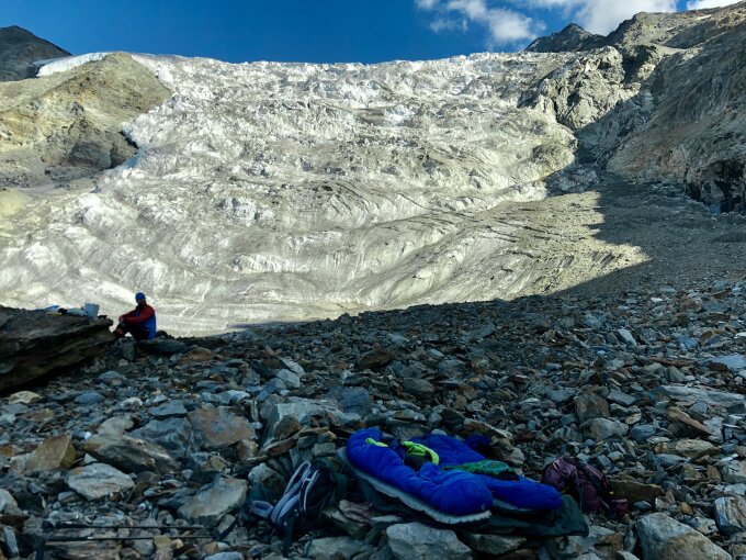 Wir sind am Mittwoch (13.07.) zum Gletscherrand unterhalb der Bordierhütte aufgestiegen und haben uns dort einen Biwakplatz auf 2700m eingerichtet (3h). Damit spart man sich morgens den Abstieg und ca. 30min.