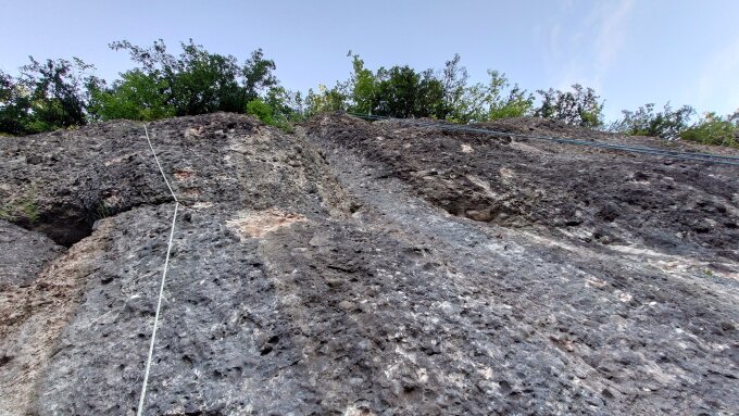 Pro Route braucht es max. 12 Express. Die Absicherung ist mit eingeklebten 10mm rostfreien Bh erfolgt. Als Umlenker findest du einen Stahlkarabiner. Du kannst auch (zusätzlich) direkt durch den zweiten Bohrhaken "fädeln".