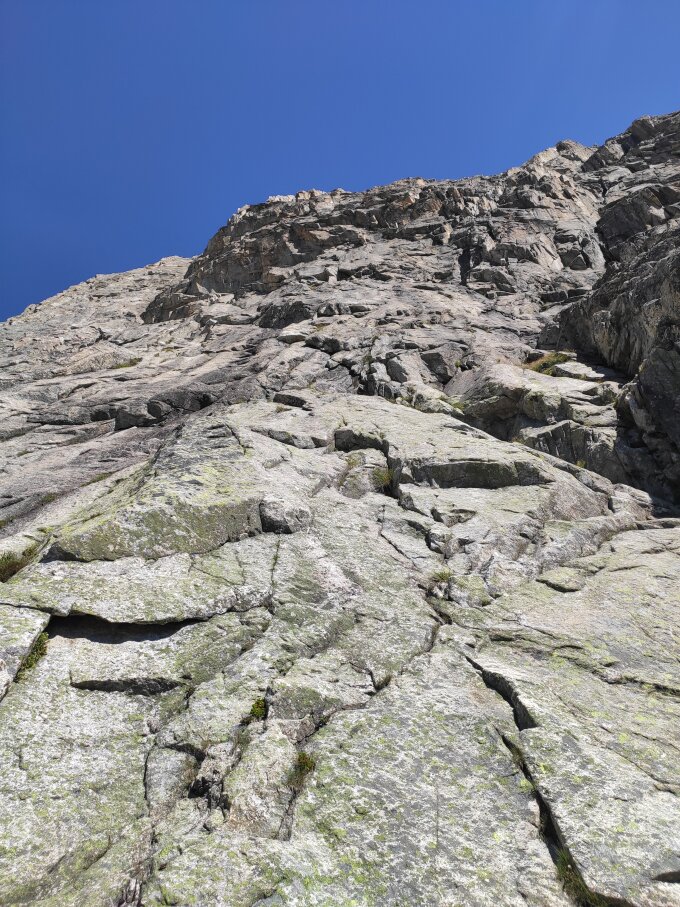 Einstieg: Nicht die von weitem sichtbare Metallplakette im linken Wandteil, anpeilen (Route: Tanti Auguri). Der Routeneinstieg ist im rechten Wandteil welcher am Morgen 17.07. um 9:00 noch im Schatten ist. Der Einstieg ist auf einem Wandvorbau ca. 20 Meter über dem Wandfuss. Und von Unten nicht sichtbar. Wir haben den Vorbau mit Steinmännern markiert. Einstieg ist die rechte Platte neben Der angeschriebenen Route Herbstwind. Erste Bohrhaken sichtbar.