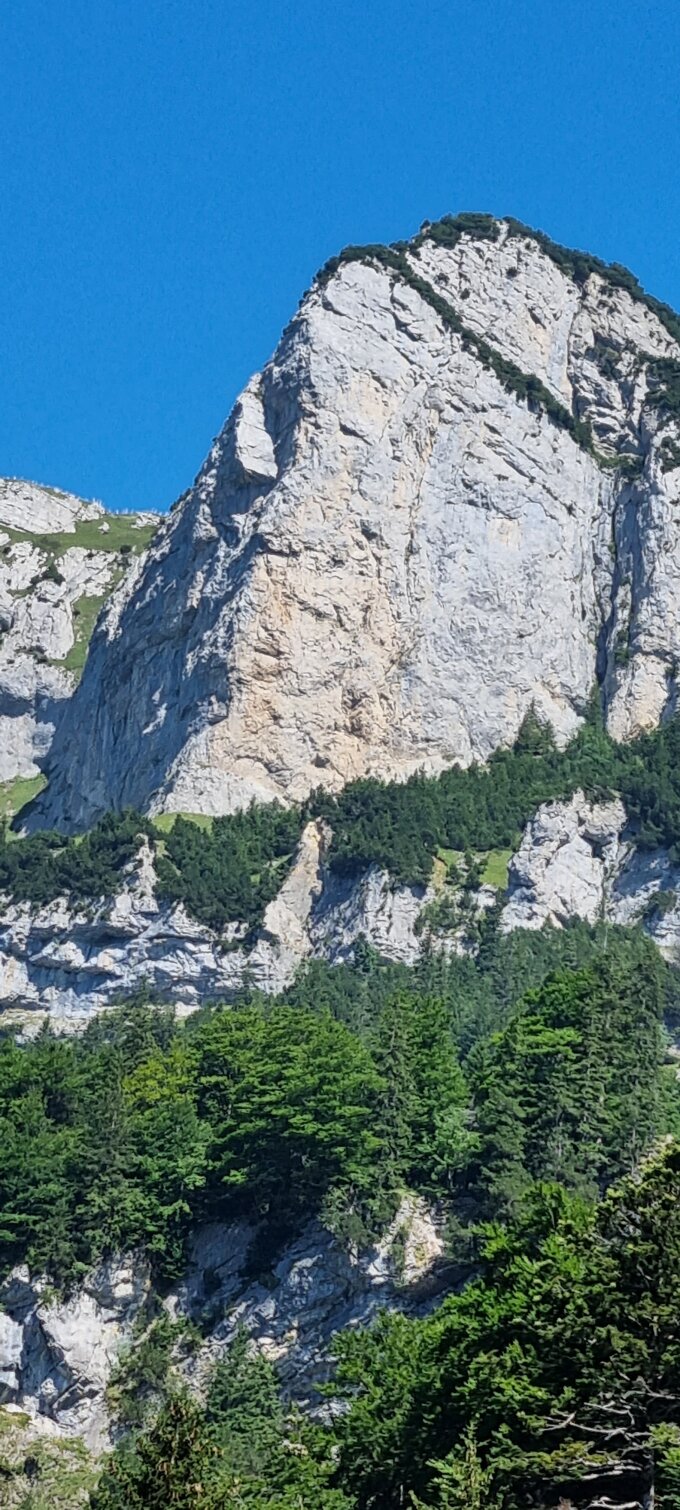Diese Route wurde 1966 erstbegangen. Damals gab es noch keinen Rotpunktgedanken. Wer sich also hier eine Freikletterperle mit schönen 6b-Zügen erhofft, wird enttäuscht werden. Wie im Führer beschrieben:" eindrückliche Route klassischen Stils.."