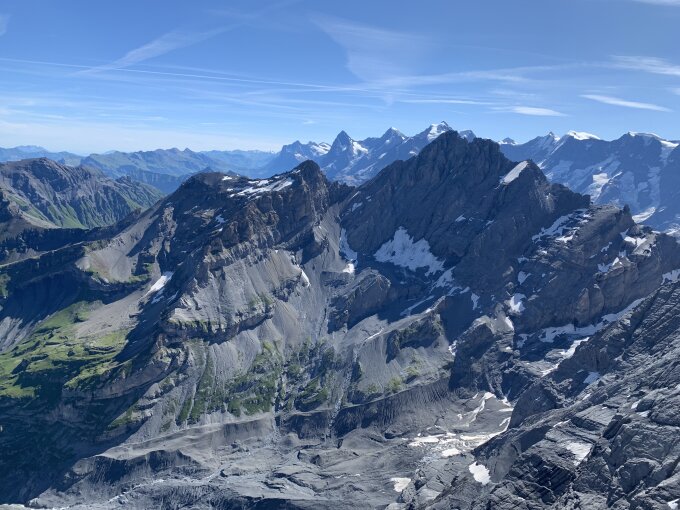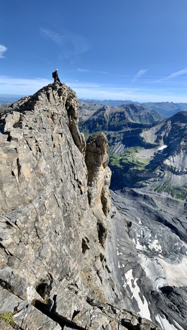Verhältnisse ausgezeichnet - sonnig, keine Menschenseele. Liegengebliebene Schneebänder können problemlos umgangen werden. Fixseil in wenigen Zügen gut erreichbar (bereits etwas "angefressen").