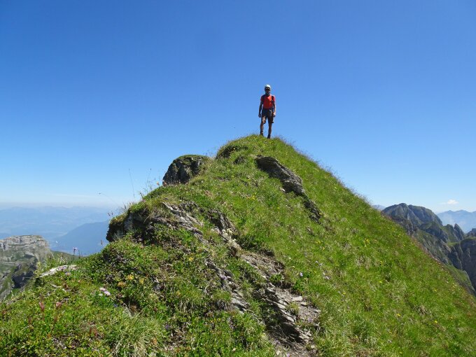 Wetter sonnig und sehr warm, im westseitigen Aufstieg angenehm schattig. Nachdem uns auf dem Weg zum Einstieg bereits ein Tourenkollege vom Gamsberg entgegenkam, waren wir allein am Berg. Talabstieg über den Schlösslichopf mit schönem Blick hinunter zum See.