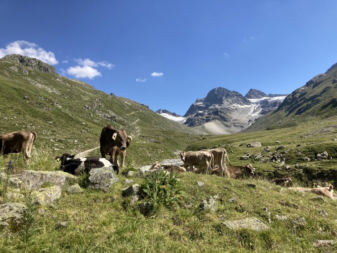Insgesamt herrschen aktuell gute Hochtourenbedingen. Es ist jedoch zu beachten das die meisten Gletscher wie auch der Ochsentalgletscher nahezu aper sind. Gletschertouren sollten früh begonnen und spätestens Mittags beendet werden. Hierbei stellt aktuell nicht einmal die Spaltensturzgefahr das größte Gefahrenpotential dar ( Spalten gut erkennbar), sondern Eisschlag oder auch reißende Gletscherbäche ( aufgrund der derzeit hohen Temperaturen) die gequert werden müssen. Bei der Route auf den Piz Buin über den Ochsentalgletscher ist zu beachten, dass die in vielen Führern erwähnte Route nicht mehr oberhalb der Grünen Kuppe verläuft sondern die Gletscherzunge wird unterhalb nach Westen gequert ( Gletscherbäche!)und in steilem Schutt der Gletscher am rechten Rand erreicht ( Steinmänner). Der bereits mehrfach erwähnte Bergsturz am Kleinen Buin in der Buinlücke erfordert weiterhin Respekt und kurzen Aufenthalt, da hier weiterhin täglich Material der Schwerkraft folgt. Ab Buin Lücke keine Steigeisen oder Pickel erforderlich.
