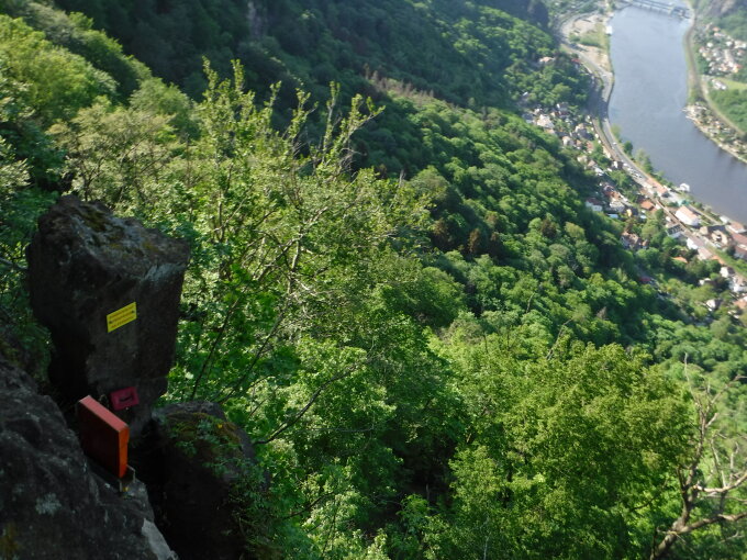 Aussicht hinab zum Elbe-Knie bei Ústí n.L., auf die Schleusen von Střekov davor und das Becken der Elbe im Osten.