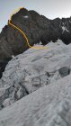 Nach ca. 100m Richtung 10 Uhr, halb links, 1 Bohrhaken unterwegs, erreicht man leicht, aber potentiell Steinschlag aus der Rinne ausgesetzt, am Nachmittag fielen einige 50 kg Steine hier vorbei !!! , die rötliche Rippe links. Hier haben alle Besteiger Steigeisen, Pickel etc. deponiert. Ab hier gibt es alle 20-30 m gute Schlingen für Stände oder zum Abseilen, max. 3-. Ab der Schulter folgt erstmal 100m leichter Schutt bis noch einige schöne Seillängen zum Gipfel kommen. Optisch sieht der Weiterweg ab Schulter schwierig aus, ist aber nie härter als 3+, wenn man gleich die richtige Linie trifft.