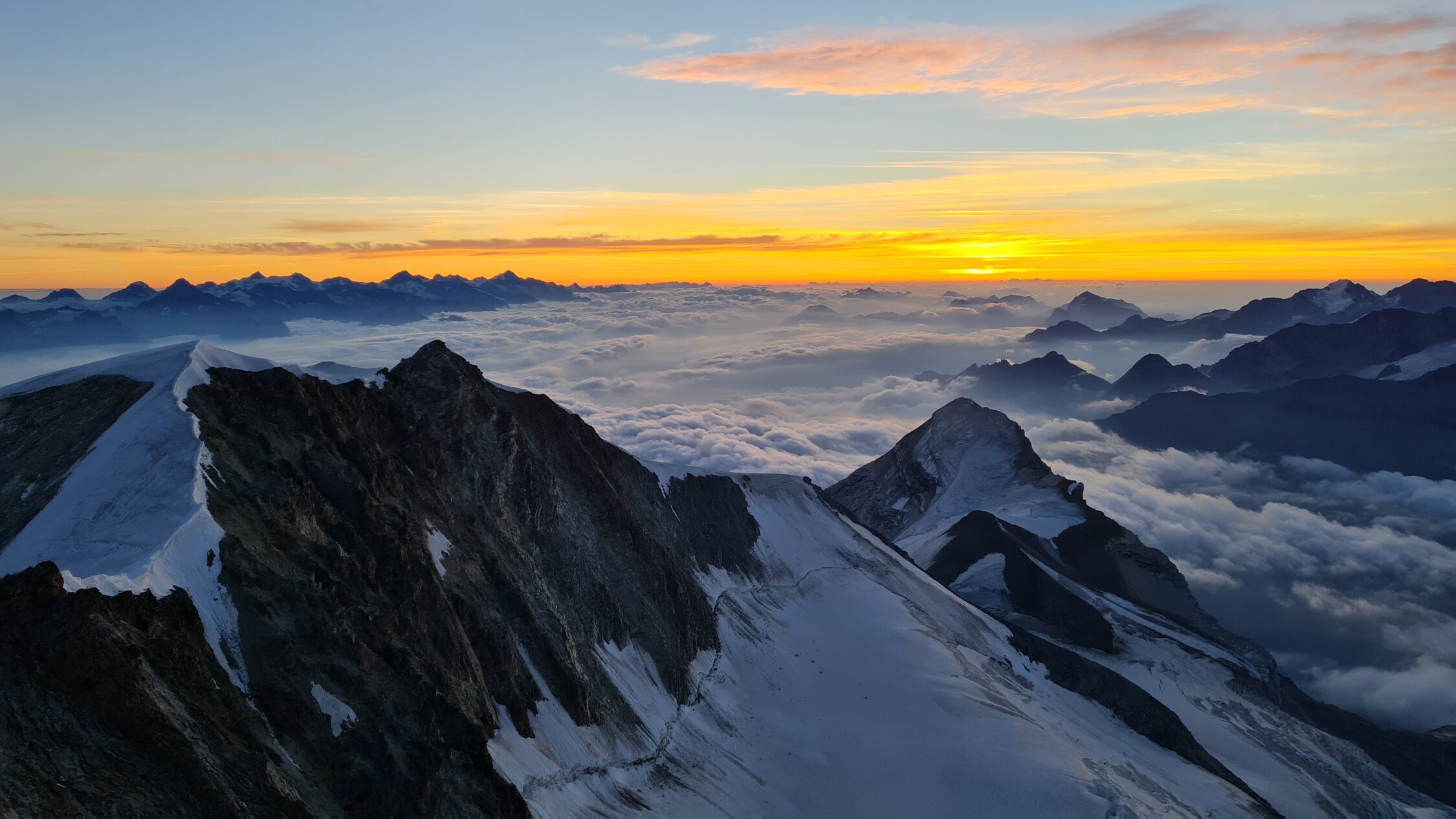 - Turtmanngletscher bis ca. 3500 größtenteils aper, danach bis Bishorn-Gipfel zunehmend mehr Schneeauflage.