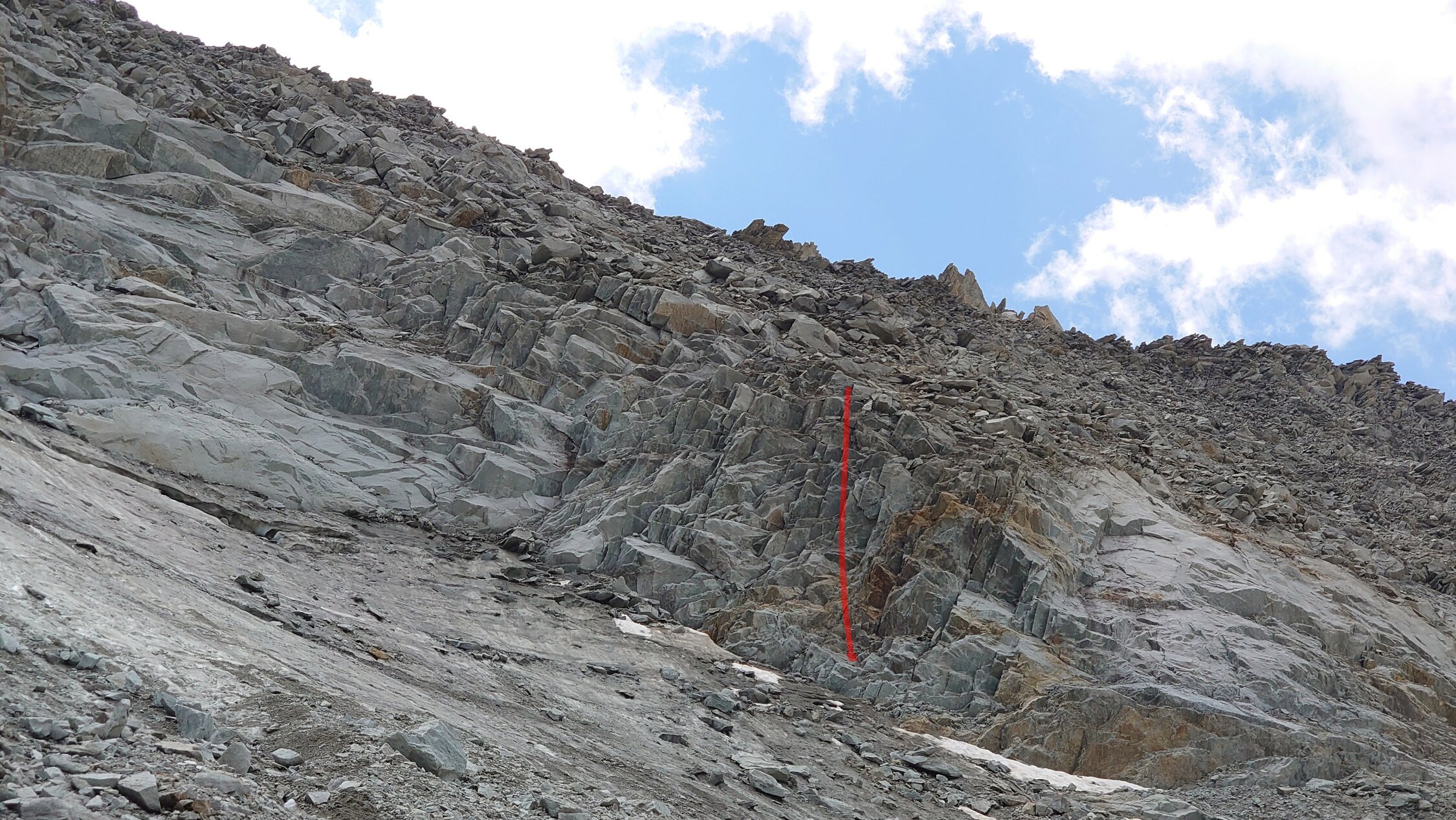 Im Abstieg in der Nordflanke sind wir denn Wegspuren und Steinmännern gefolgt, bis es steil wurde. Die gebohrten Stände konnten wir nicht mehr finden. Dafür aber diverse Anzeichen für einen frischen Felssturz. Wir vermuten, dass die gebohrten Stände abgestürzt sind. Einige Meter unter dem letzten Steinnann hat jemand mit einer Kevlarschnur und einem Maillon etwas an einem soliden Zacken eingerichtet. Von dort kommt man mit 25m auf eine kleine Schuttterasse kurz vor dem Gletscherresten. Weil dieser gut gesplittet ist, sind momentan weder Steigeisen noch Pickel nötig.