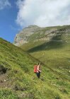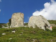 Trotz Regen am Vortag und feuchten Waldwegen Grasaufstieg in der steilen Südflanke trocken und bestens begehbar. Beliebige Routenwahl hier, der Hang ist recht gut gestuft.