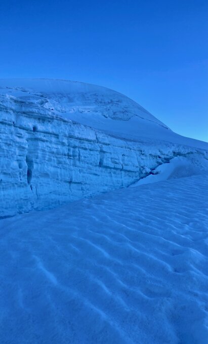 Start um 3.50 Uhr ab Britanniahütte bei leicht diffusem Nebel in Richtung Allalingletscher und weiter auf dem aperen Gletscher hoch zum Allalinpass auf 3356m. Ab da müssen einige grosse Spalten, dem aktuell grossen Schneemangel geschuldet zuerst nordwestlich umgangen werden. Der normale und direkte Routenverlauf vorbei an den zwei Felsrippen wird diese Saison nicht mehr möglich sein. Die Route verläuft momentan ca 100m tiefer. In der Gletschermulde um ca 3600m sind einige heikle Schneebrücken zu queren. Hier empfiehlt es sich früh zu sein um diese bei solidem Firn passieren zu können. Danach in gutem Trittfirn hoch zum Rimpfischsattel. Der Bergschrund kann zurzeit noch gut rechts umgangen werden. Ab Rimpfischsattel in trockenem und gutem Fels hoch zum Gipfel. Im aperen Einstiegscouloir ist frühmorgens allenfalls Wassereis anzutreffen. Steinschlag ist im Tagesverlauf ebenfalls nicht auszuschliessen. Die exponierteren Kletterpassagen können beim Abstieg entweder abgeseilt oder aktuell auch gut abgeklettert werden.