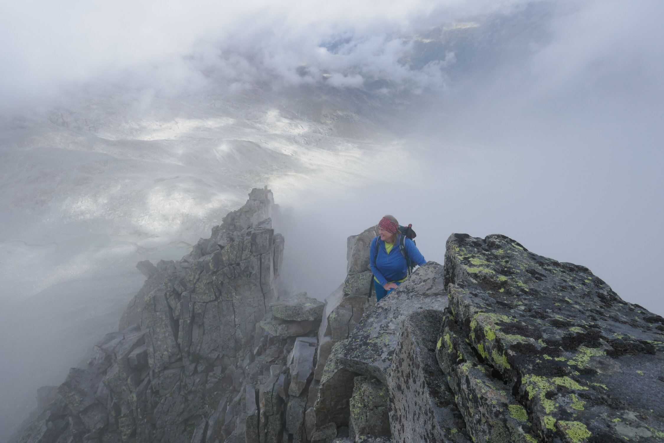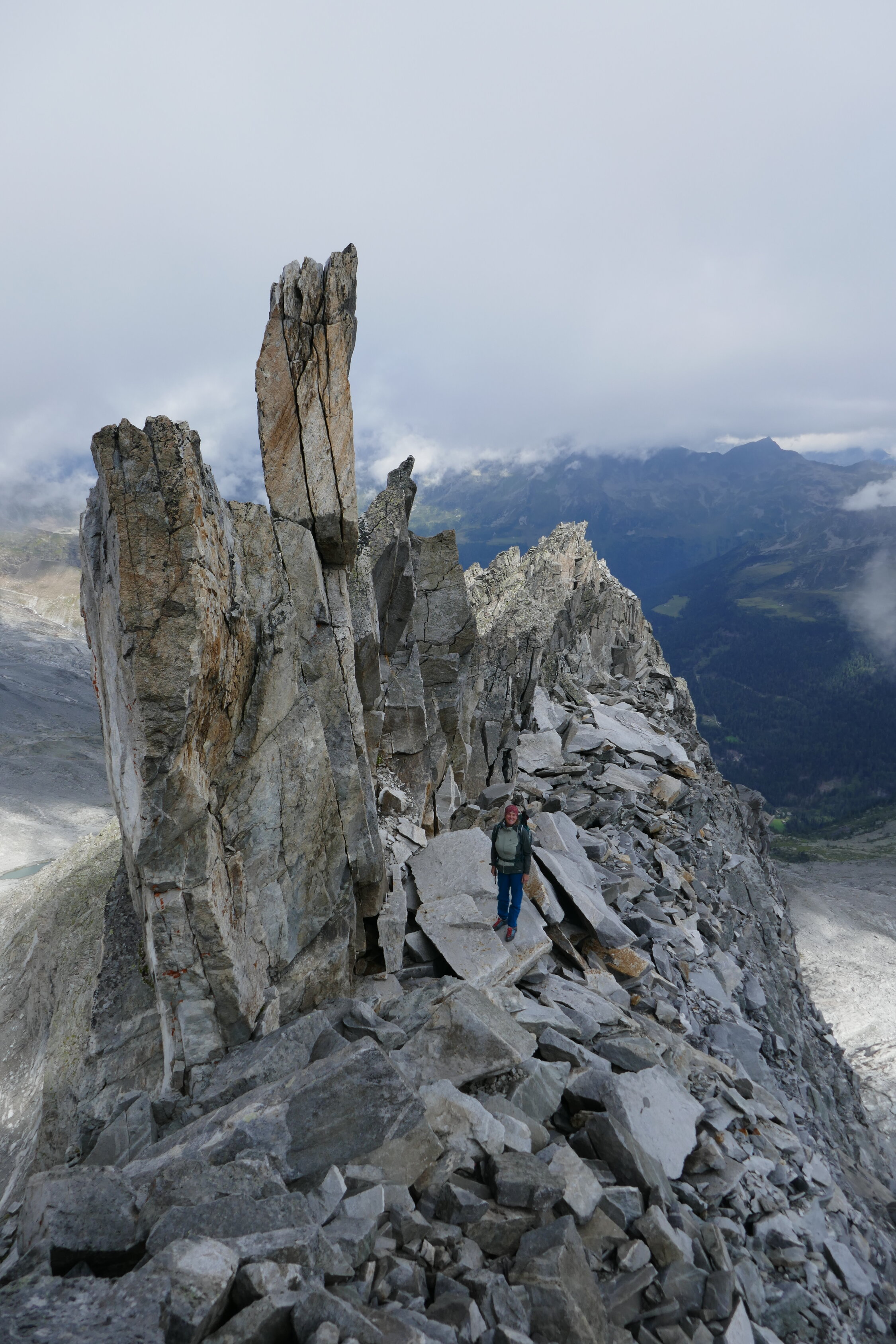 Die Verhältnisse sind optimal. Keine Schnee- oder Eisberührung. Ein Ausweichen in den Firn links des Grates ist nicht mehr möglich.