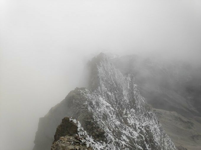 Bergschrund unter dem Lagginjoch wird breiter, Aufstieg war nicht gerade trivial. Auf dem Grad, teilweise winterlich - das aber nur auf der Westseite.
