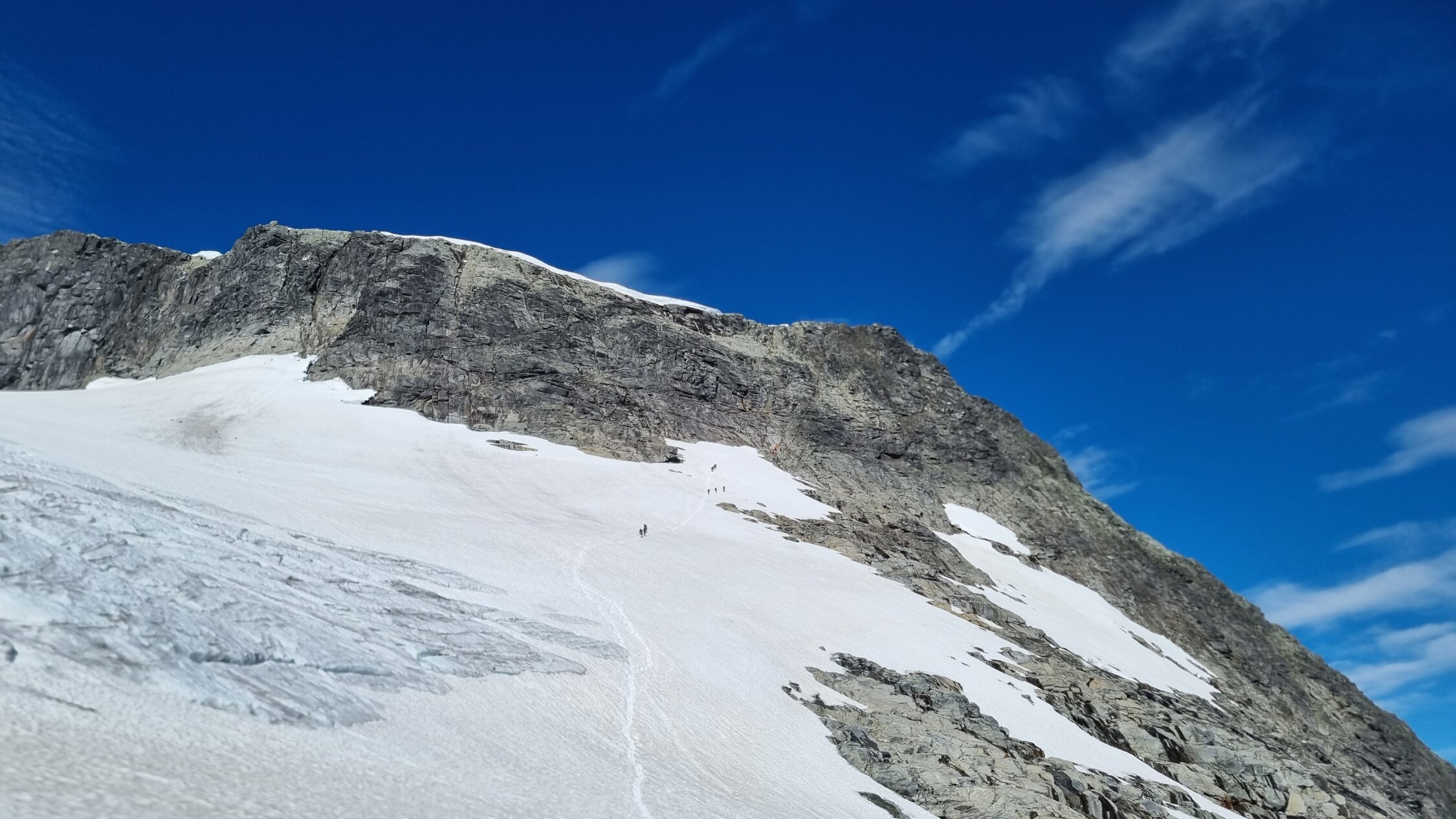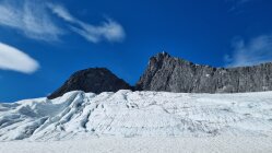 Der Gletscher apert mehr und mehr aus, im oberen Teil jedoch noch Firn. Momentan keine Steigeisen u. Schrauben notwendig. Könnte sich aber in ein paar Wochen ändern. Die Kletterei ist bei trockenem Wetter einfach, bei schönem Wetter sind hier immer Leute unterwegs, so Helm mitführen.