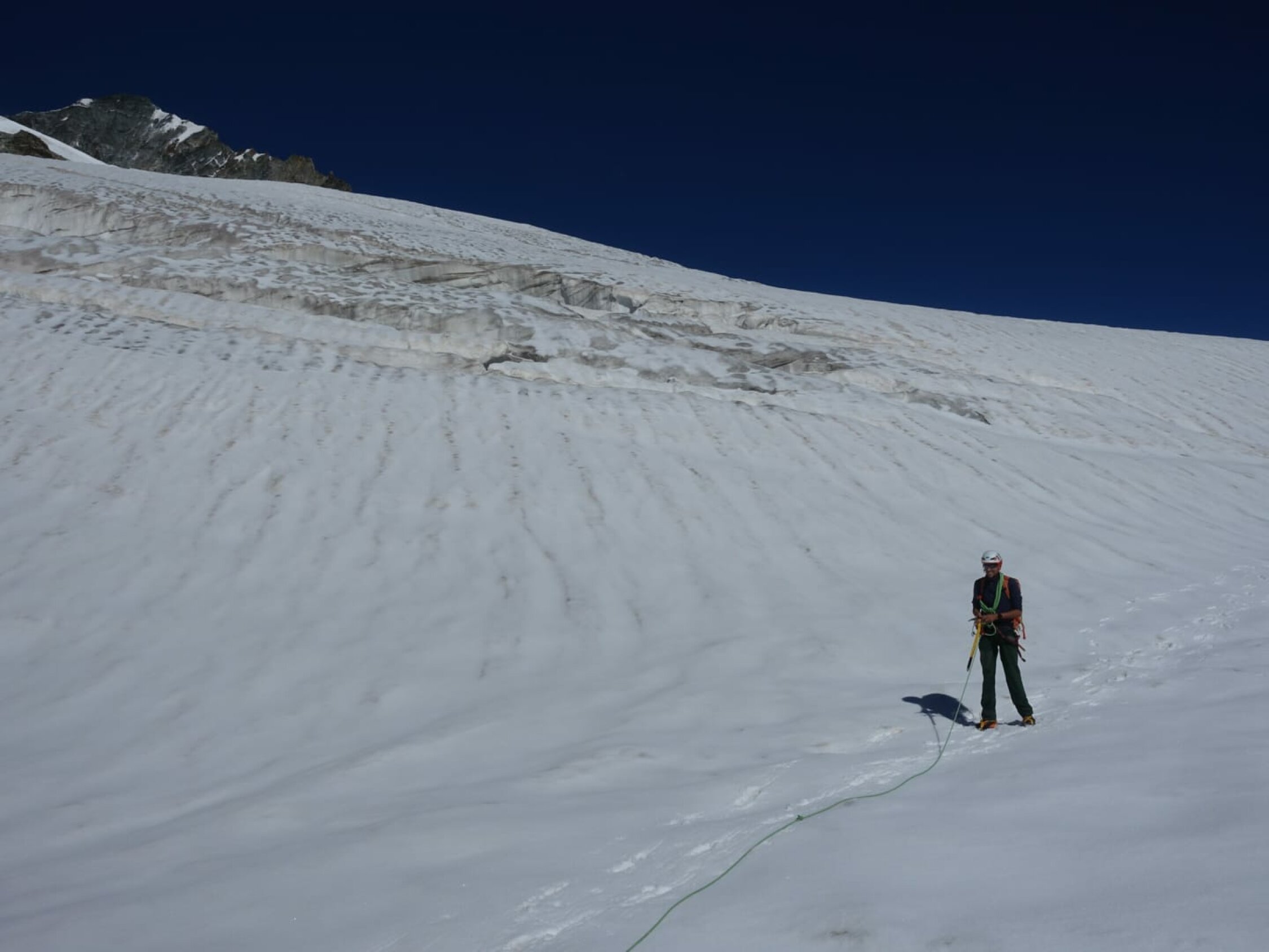 Top Verhältnisse, Spalten gut sichtbar. Ab 3300m noch Altschnee. Schnee/Gletscher gefroren am Morgen bis ca. 10h. Fels trocken beim Klettern. Route problemlos machbar.