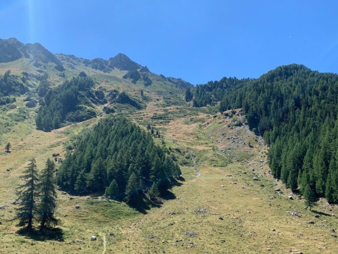 Recht einsame Route durch super Natur. Steinboecke im Wald, murmeltiere, Schmetterlinge, Alpenhuehner usw. Panorama nicht nur uberm Rhonetal aber auch z.b. Grand Combin und Weisshorn. Insgesamt 23km und 1400hm auf/ab. Wanderwege nicht so ganz einfach zu folgen...